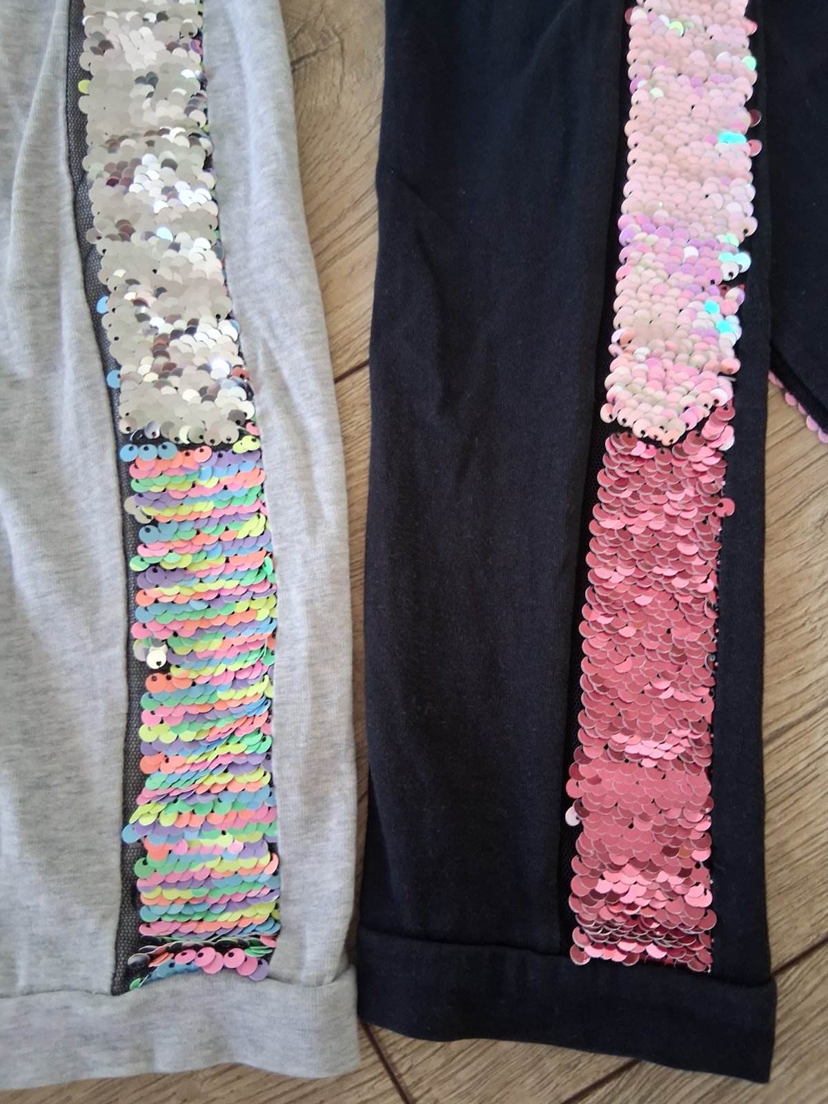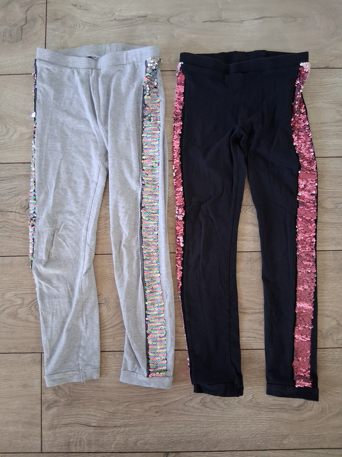 Nosené legíny v dobrom stave, s premieňacími trblietkami. Čierne predávam, sivé grátis. Na sivých sú malé dierky na zadku, treba zašiť🙂