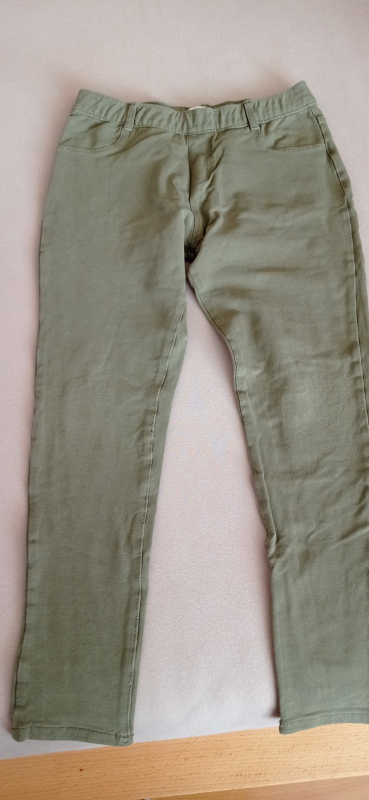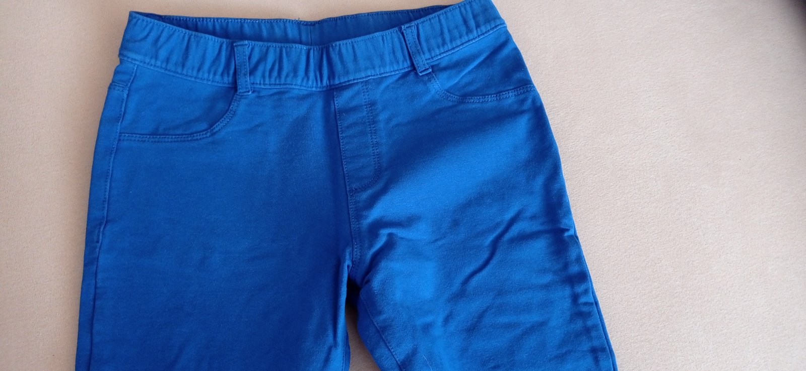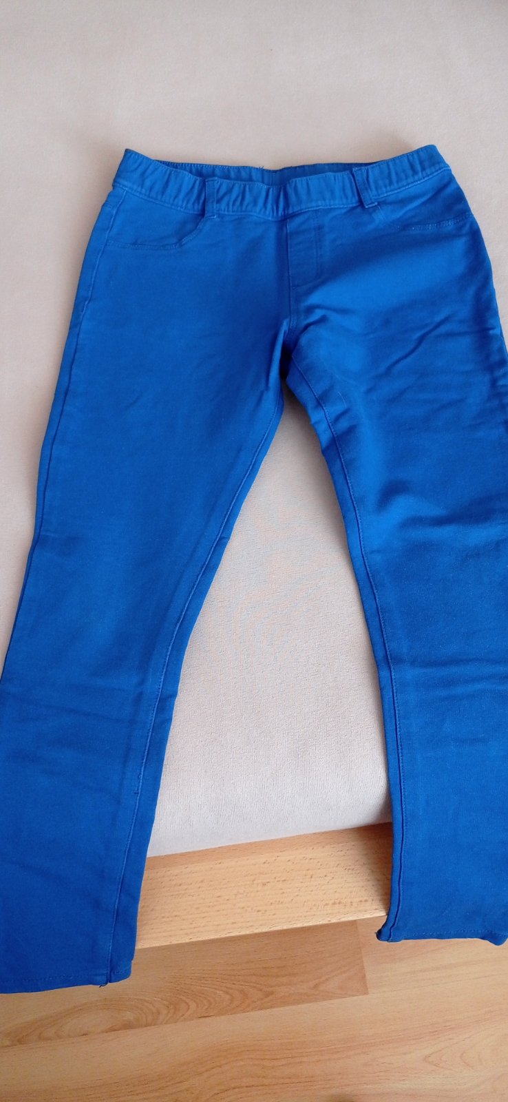 Dvoje tvamomodré legínky s bielimi pásikmi, kúpené v Tesco. Veľkosť písaná 12-13r ale skôr sedia na 152. Celková dĺžka je 81 cm, pás 30 cm a dole ako je členok je šírka 11 cm. Legínky sú klasické,...