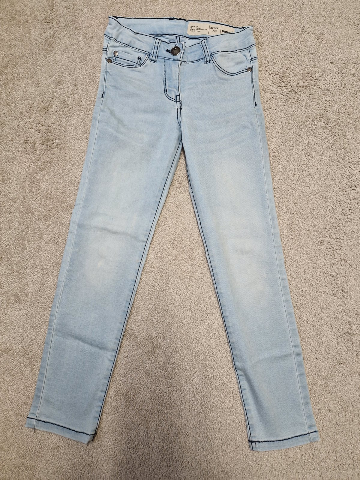 Elastické skovne leginky, bledomodra riflovina. Pohodlné funkcne vrecká. Pás 56 cm, regulovateľný. Dĺžky 78/55cm. Máličko nosené. Dobre sa kombinujú.