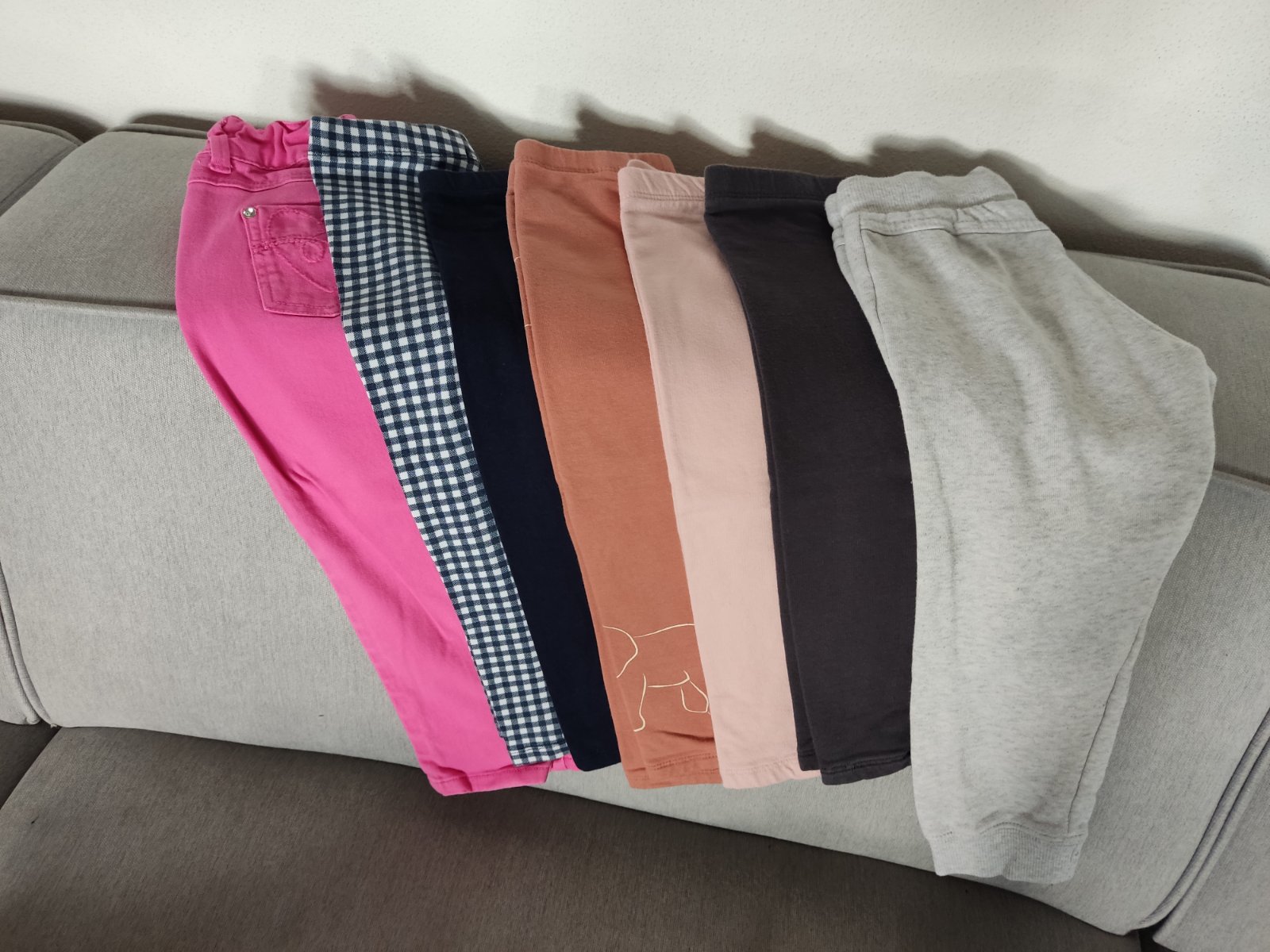 Ružové nohavice, 3x teplejšie legíny, káro a tmavomodré legínky, tepláky , všetko 2-3 roky, ako nové, 1€/kus