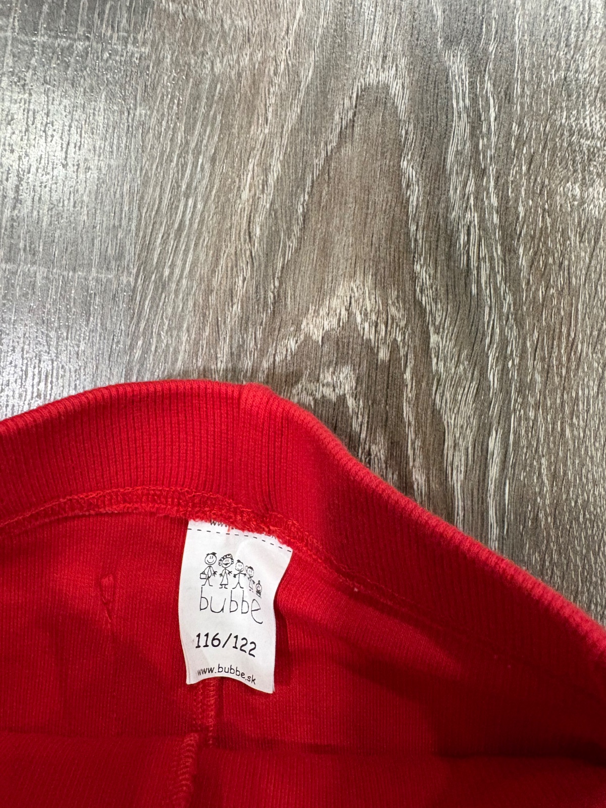 77.Bubbe červene vrubkovane leginy vo velkosti 116/122.Dlzka je 63cm a sirka v pase je od 22x2cm do 30x2cm