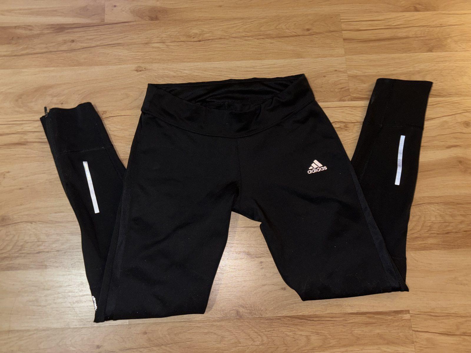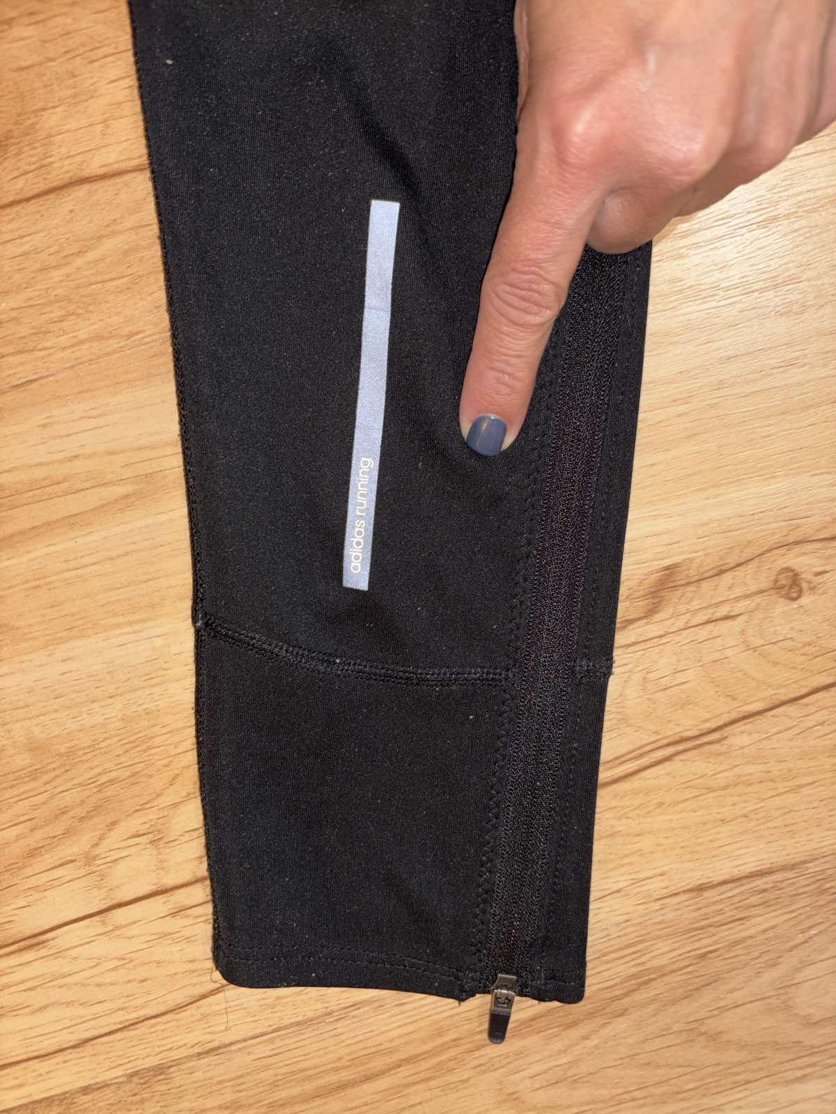 Výborný stav až na drobné zasitie na lýtku- ukazujem prstom, funkčné na beh, vnútorná šnúrka, vrecko, reflexné pasiky, dole zipsy, sedia na S/M, pás v pokoji 34 cm, dĺžka 84 cm