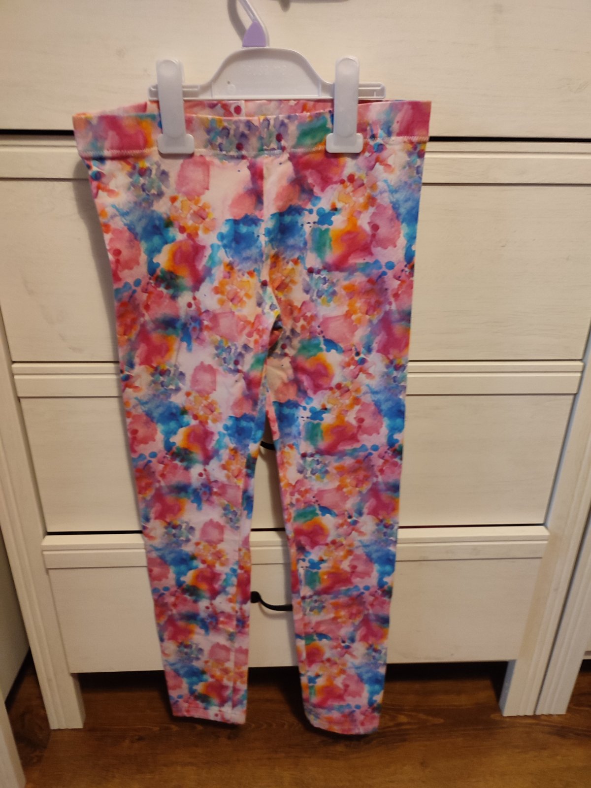 Mňou šité legíny z úpletu, na 8-10 rokov, pás s gumičkou 33-43 cm, dĺžka 88 cm, vnútorná dĺžka 64 cm.