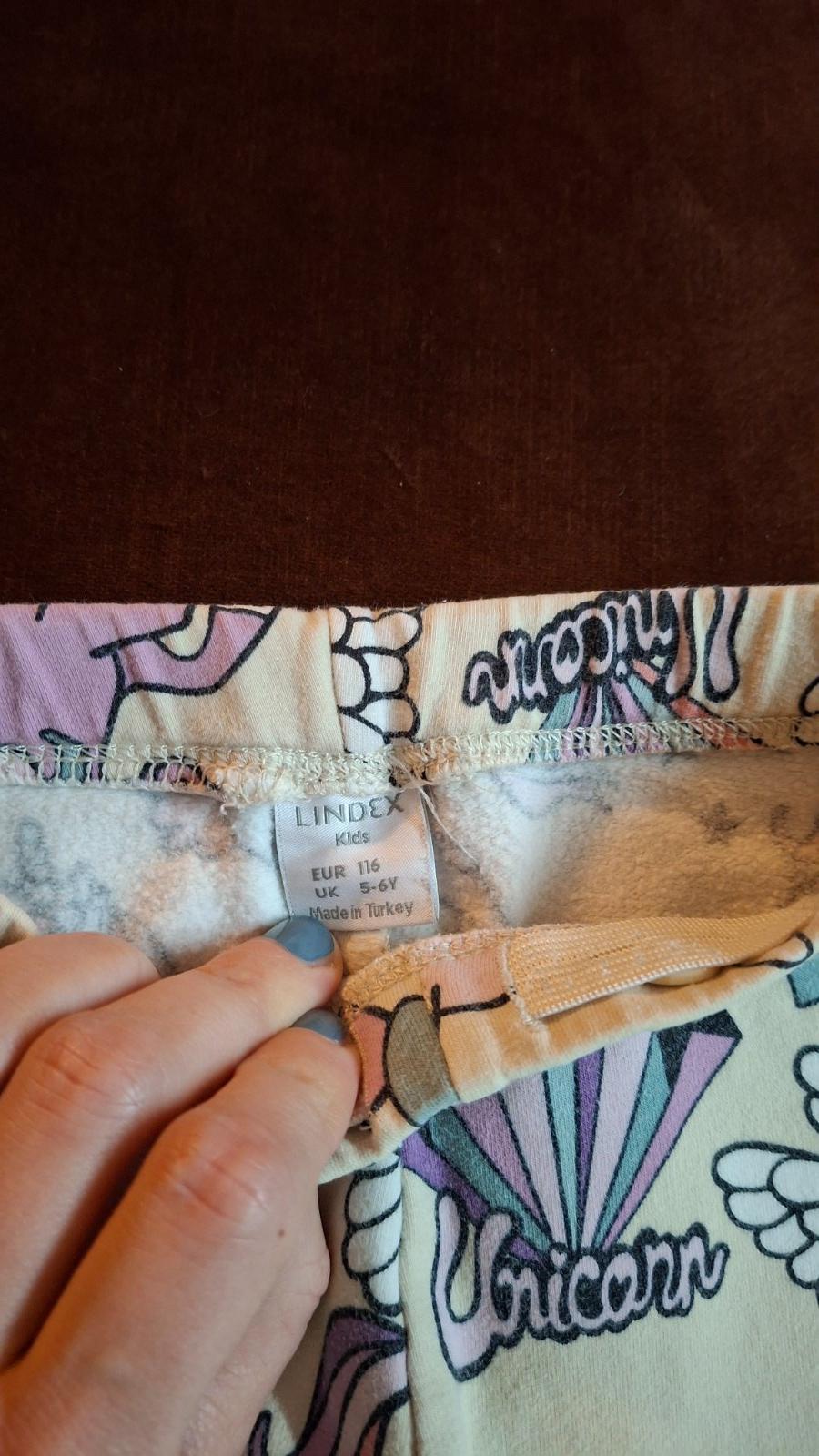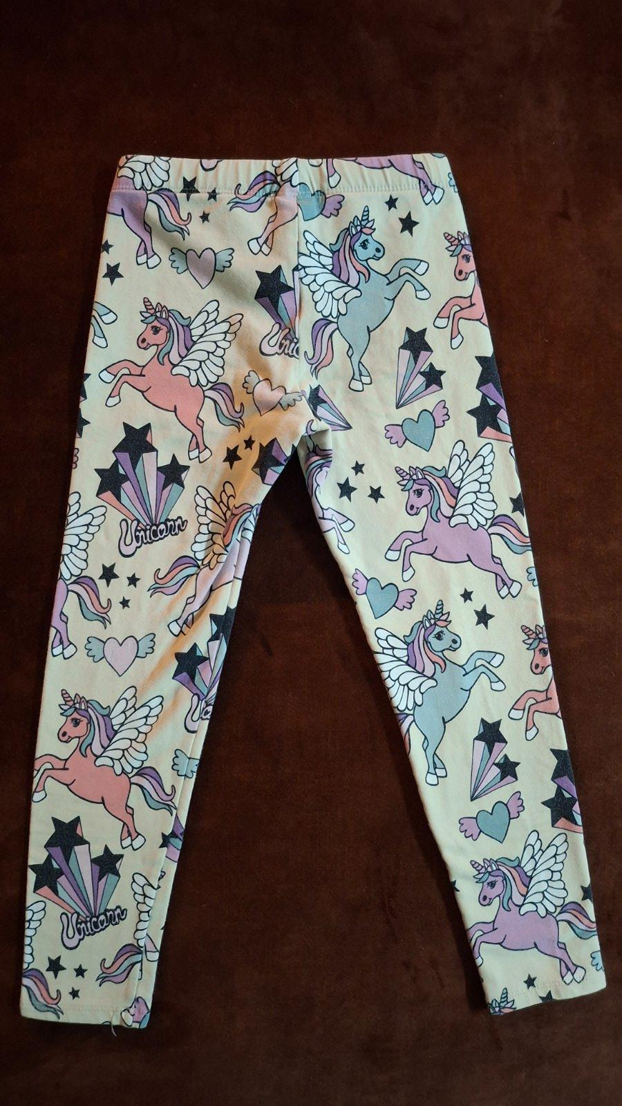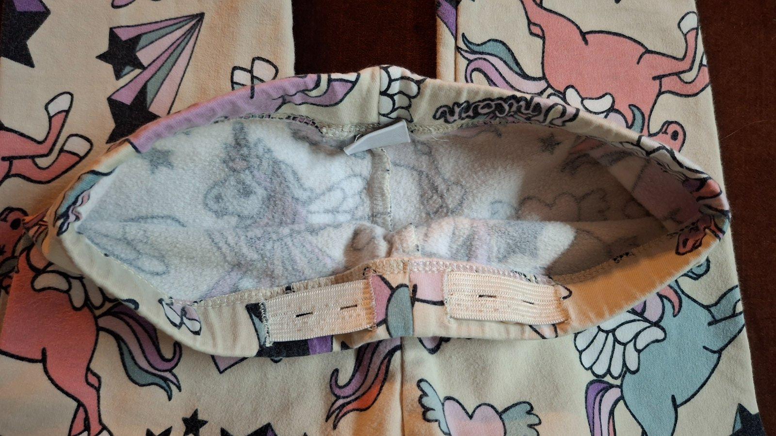 Zateplené legíny s motívom jednorožcov. Regulovateľný pás. Dĺžka 61 cm, dĺžka od pudla 44 cm, pás 23 cm, šírka 29 cm.