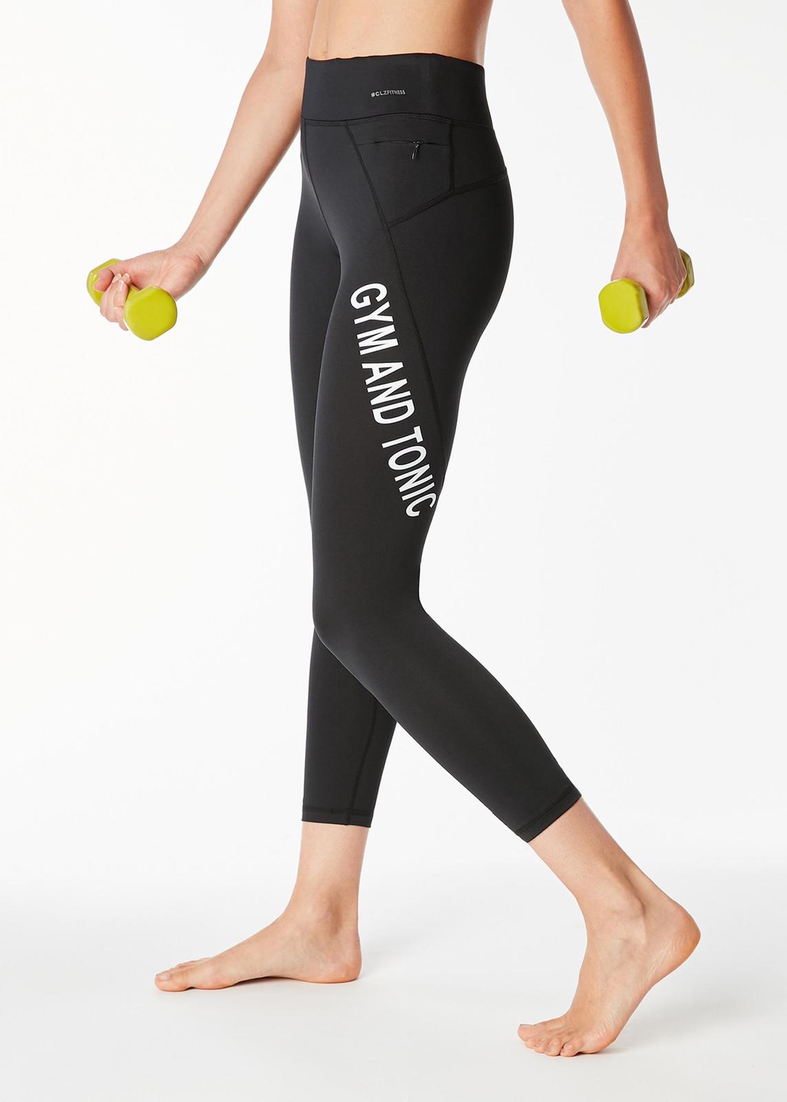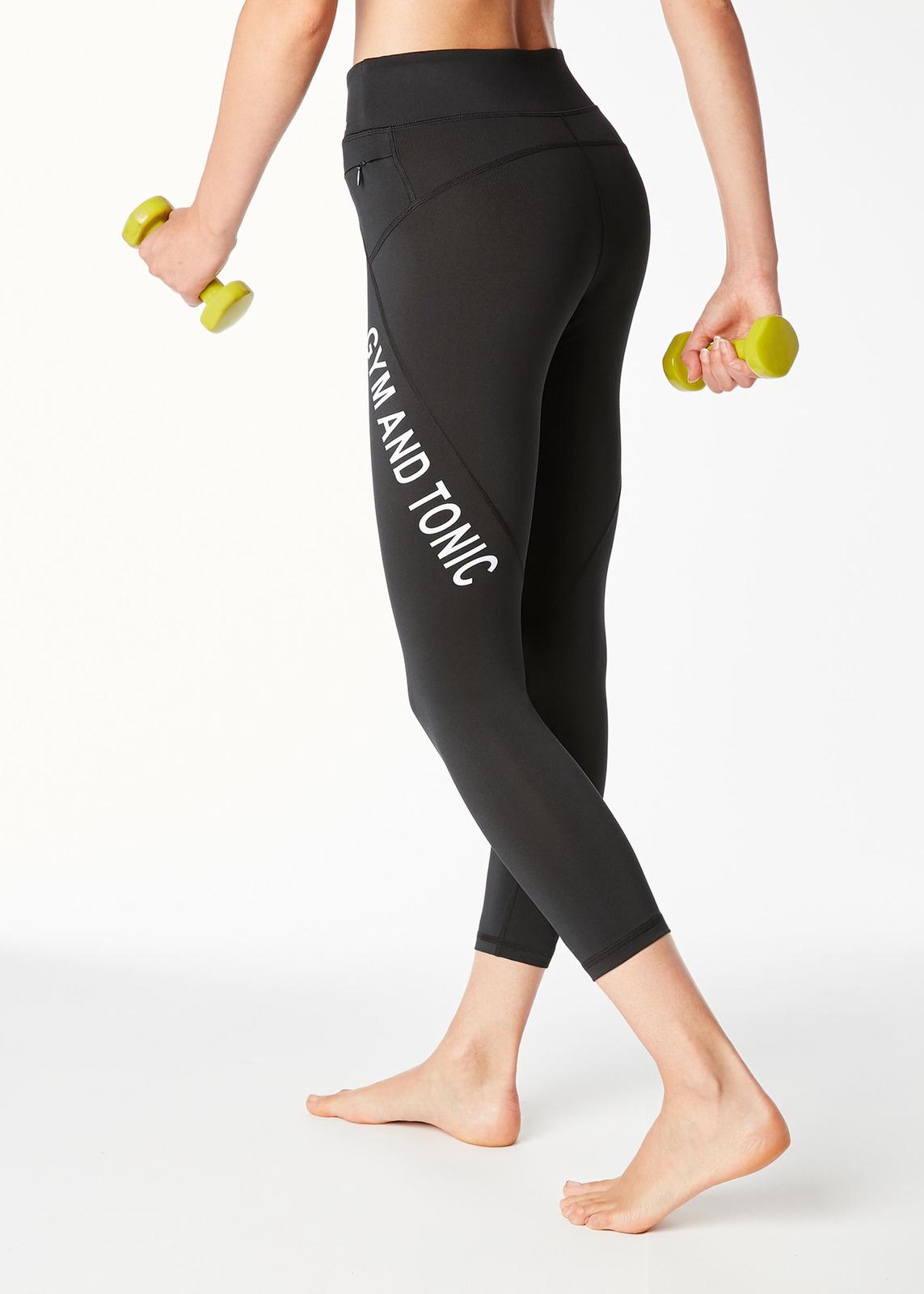 Asi dvakrát oblečené športové legíny značky Calzedonia s vtipným nápisom GYM AND TONIC. V čiernej farbe, veľkosť písaná S, ja by som povedala, že sedia na XS-S. Dĺžka je 7/8.