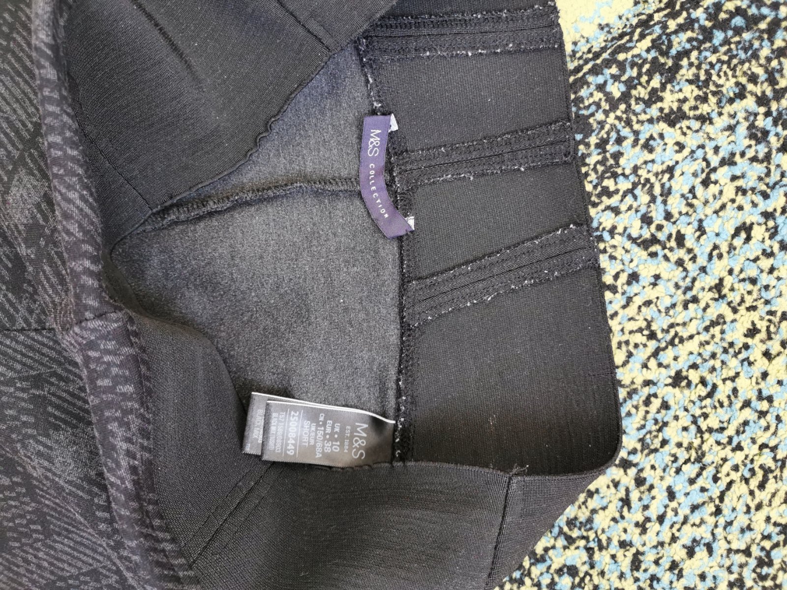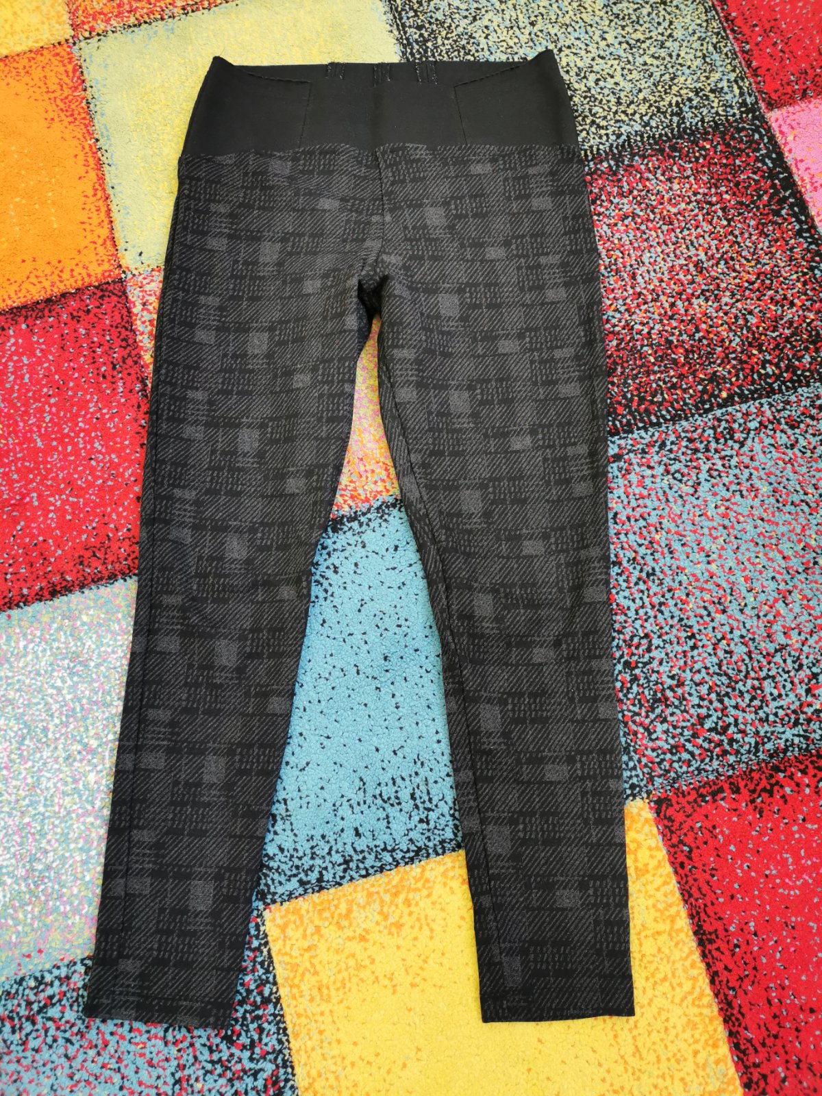 Pekne cierne,elasticke,nie moc tenke, malo nosene, iba pri stepovani zadnych vreciek malilinke dierocky. Po zasiti nevidno.Dl.101cm, pas 39x2cm.