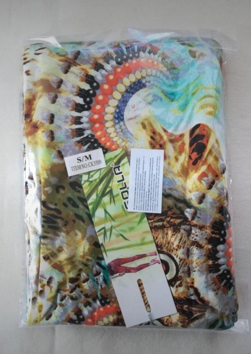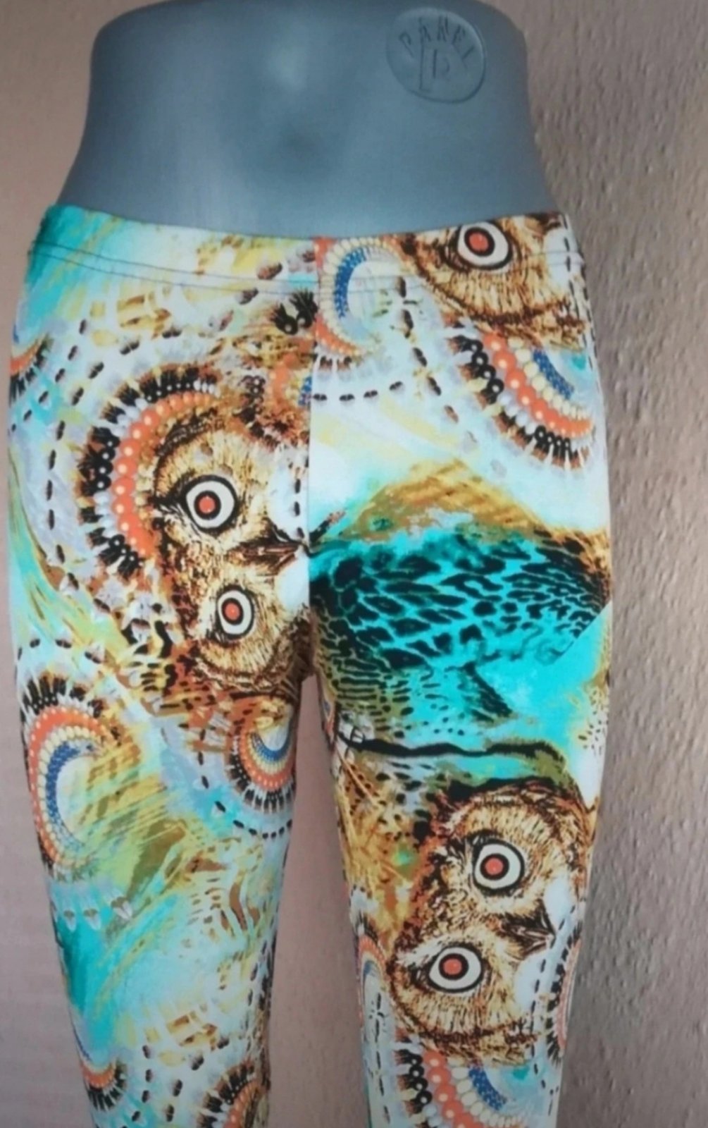 👉 Nenosené, nové, elastické pestrofarebné dlhé legíny, vzor sova.