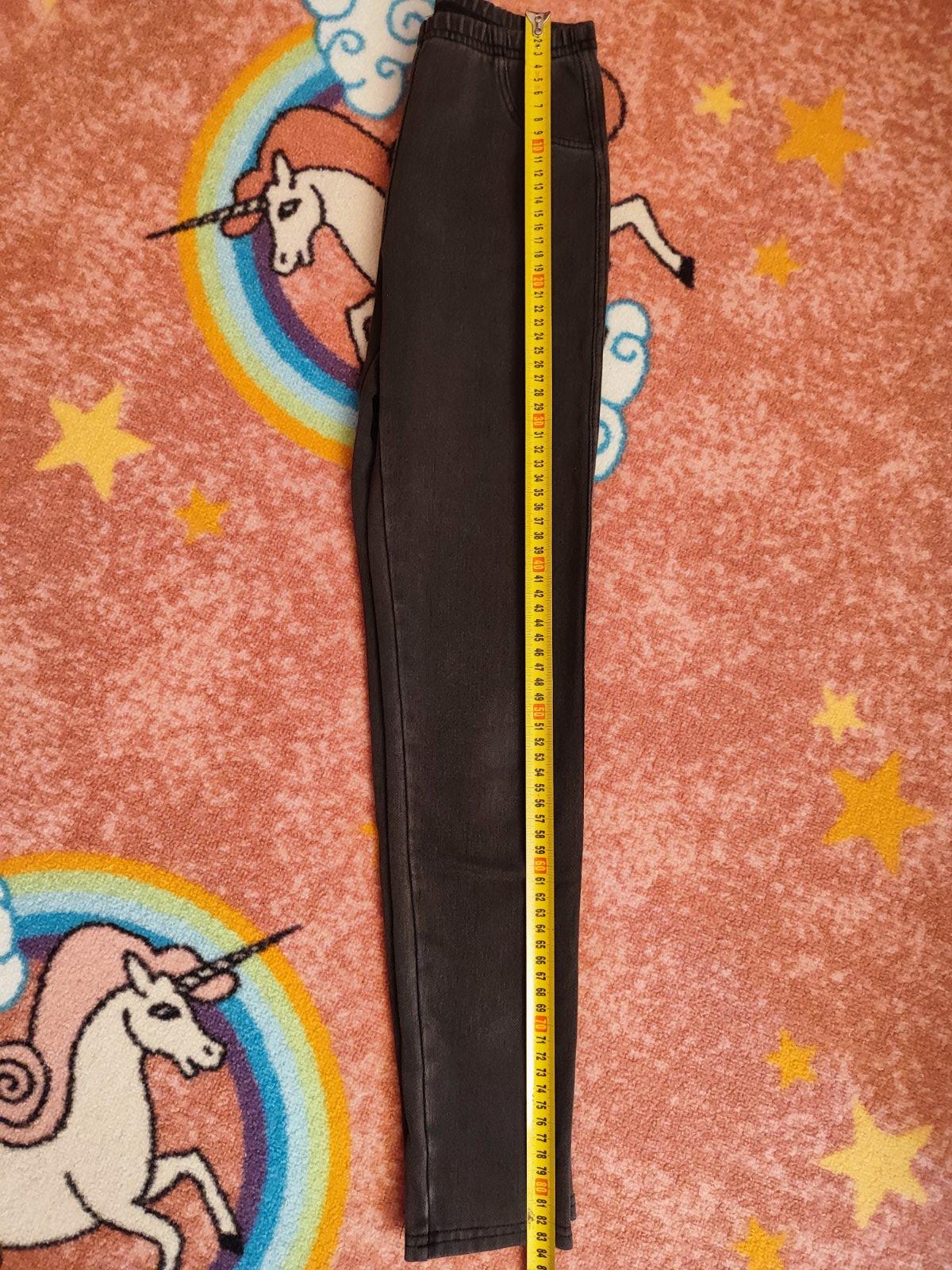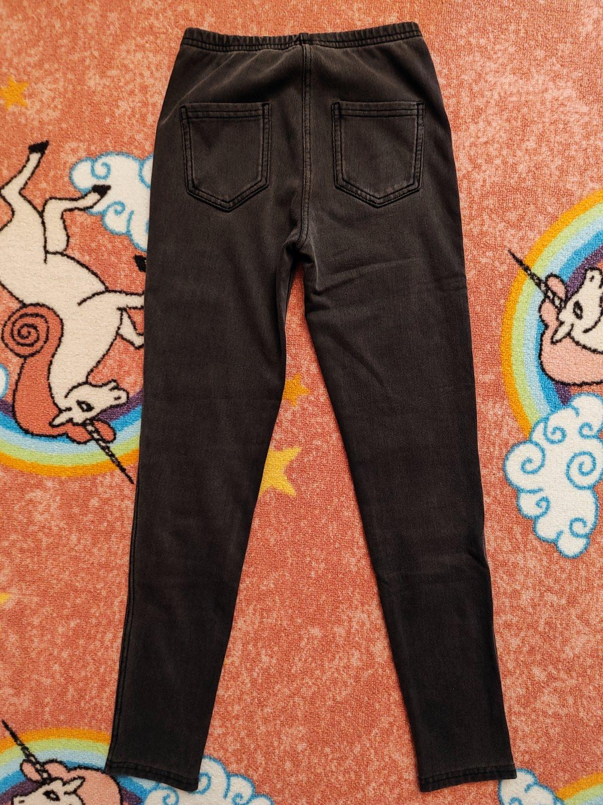 Pekne šedé leginky vzhľad ako rifle, viac nosene, veľkosť cca 134, pohodlne. Lesklé guličky