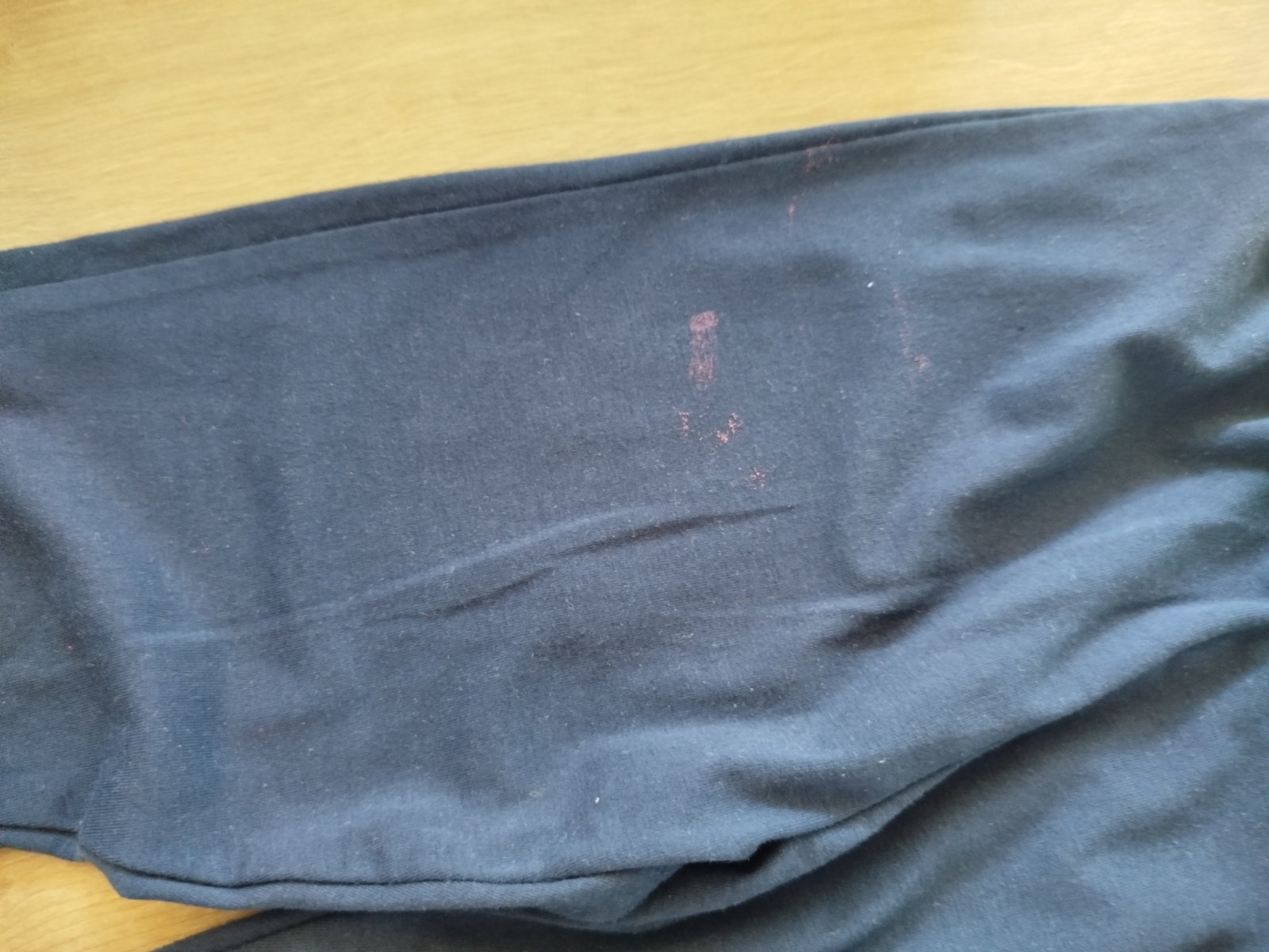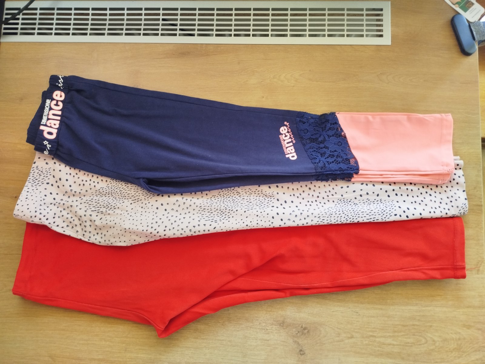 Nosené legíny, na tmavo modrých legínach je na stehne fliacik od farby, ostatné bez poškodenia