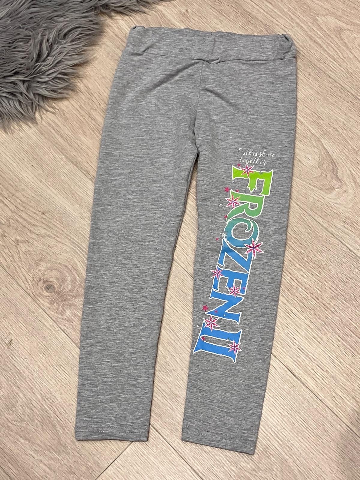 Dievčenské sivé melírované teplákové legíny, pás na gumu, s nápisom Frozen, elastické, materiál: 70%bavlna30%polyester.