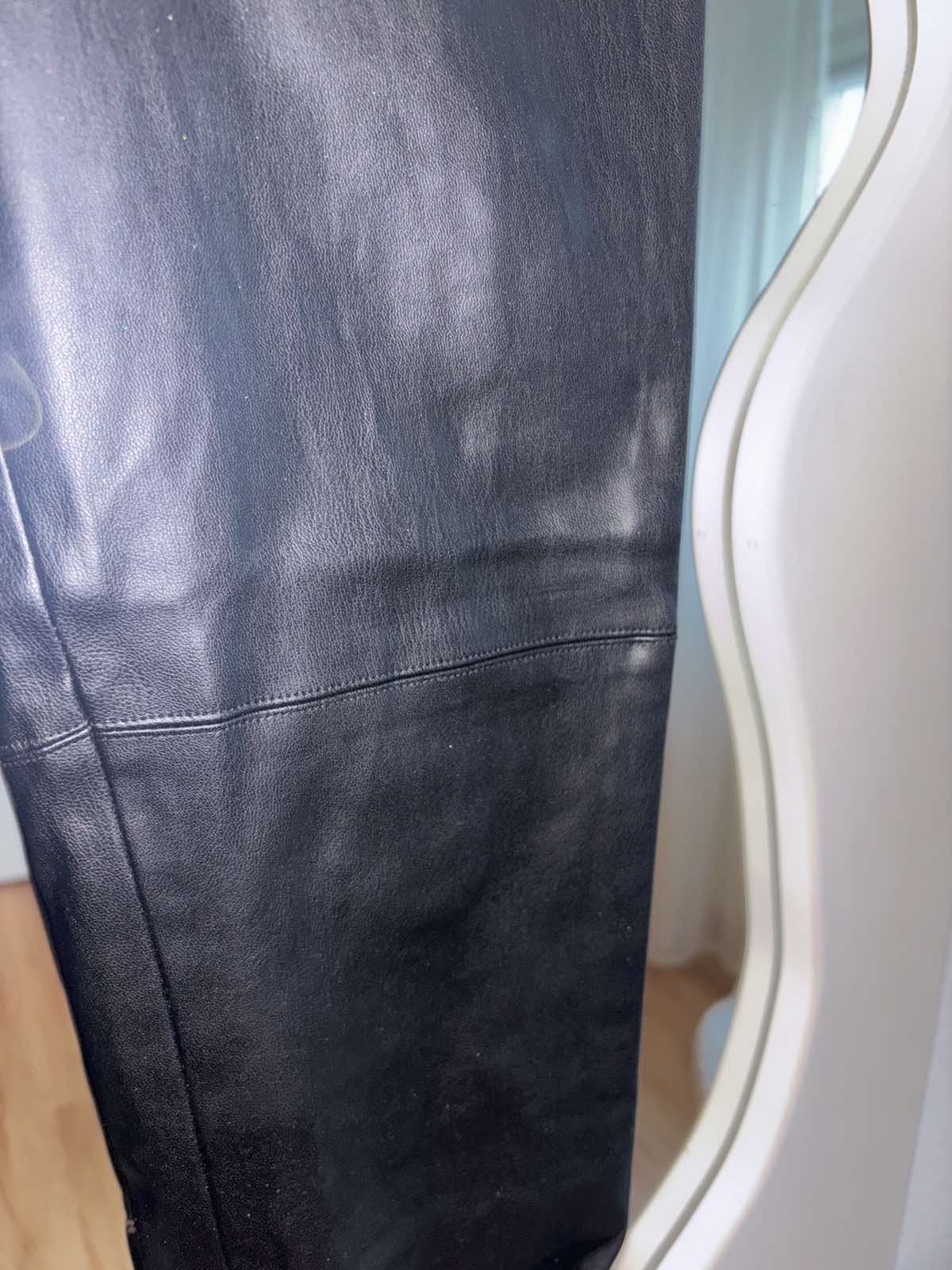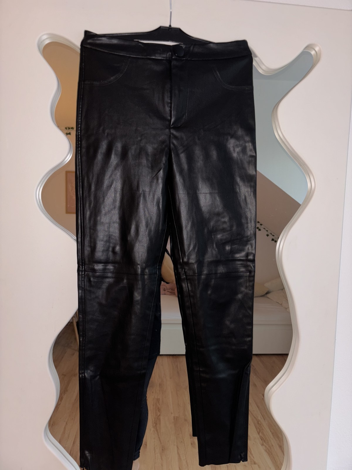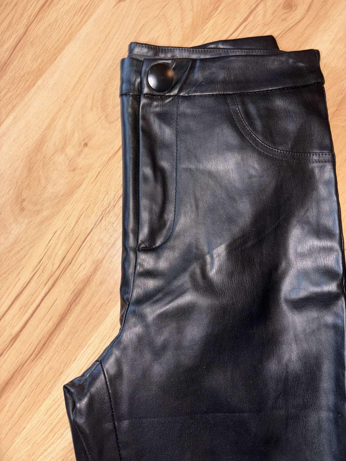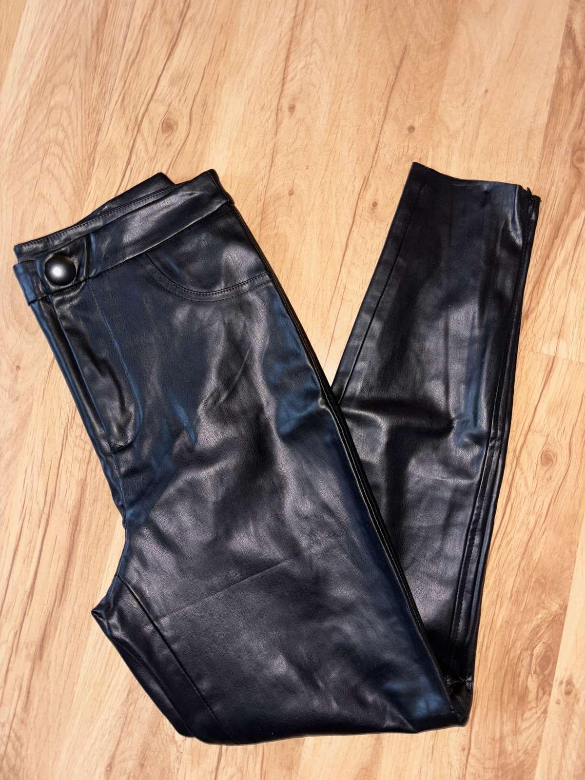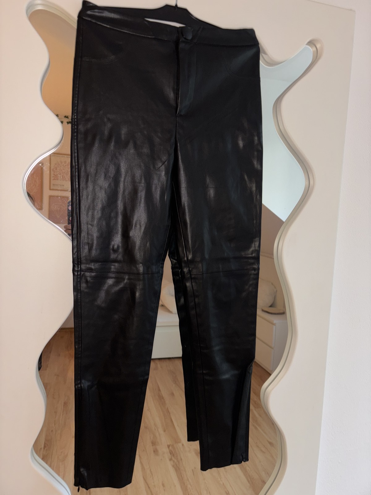 Veľmi dobrý stav, čierne, vysoký pás, poškodenie koženky na zadku-ofotene v detaile, veľkosť 36,pás 35 cm, dĺžka 95 cm, vnútorná dĺžka 68 cm, predný sed 28 cm