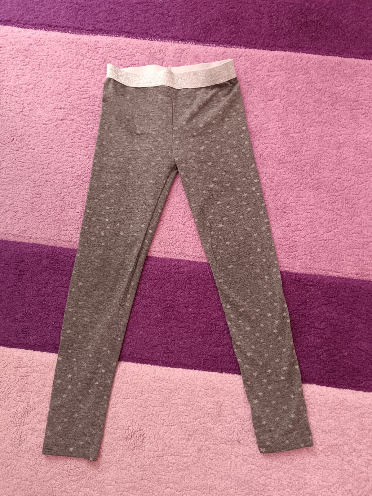 Legíny vo veľmi dobrom stave bez poškodení. Zvnútra česaná bavlna. Písaná veľkosť 128, no sú menšie, preto sme ich aj krátko nosili. Dĺžka od rozkroku 44 cm.
