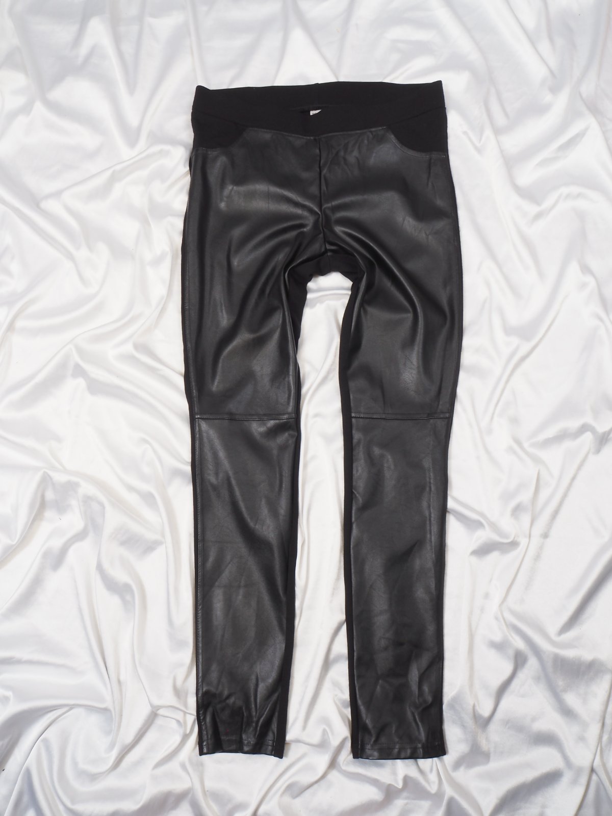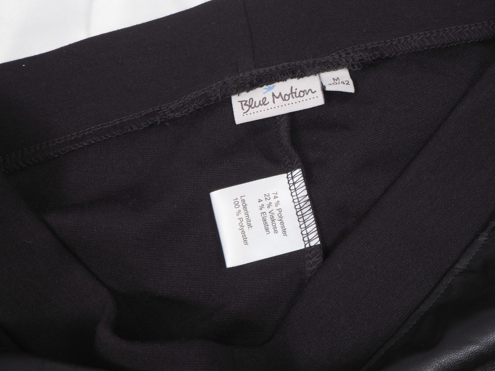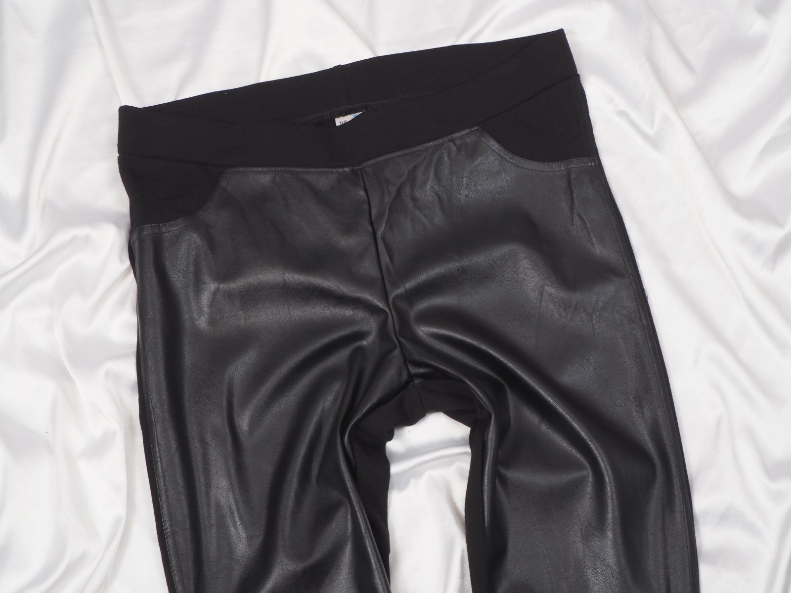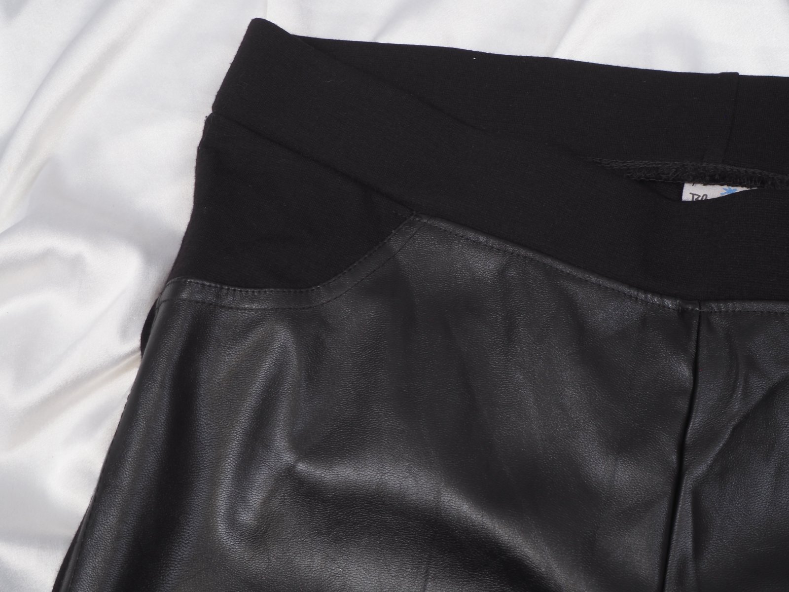 Kvalitné koženkové legíny, vzadu strečové, predný materiál 100% polyester, zadný materiál 74% polyester, 22% viskóza, 4% elastan, super stav.
