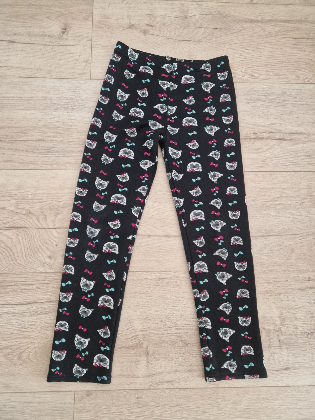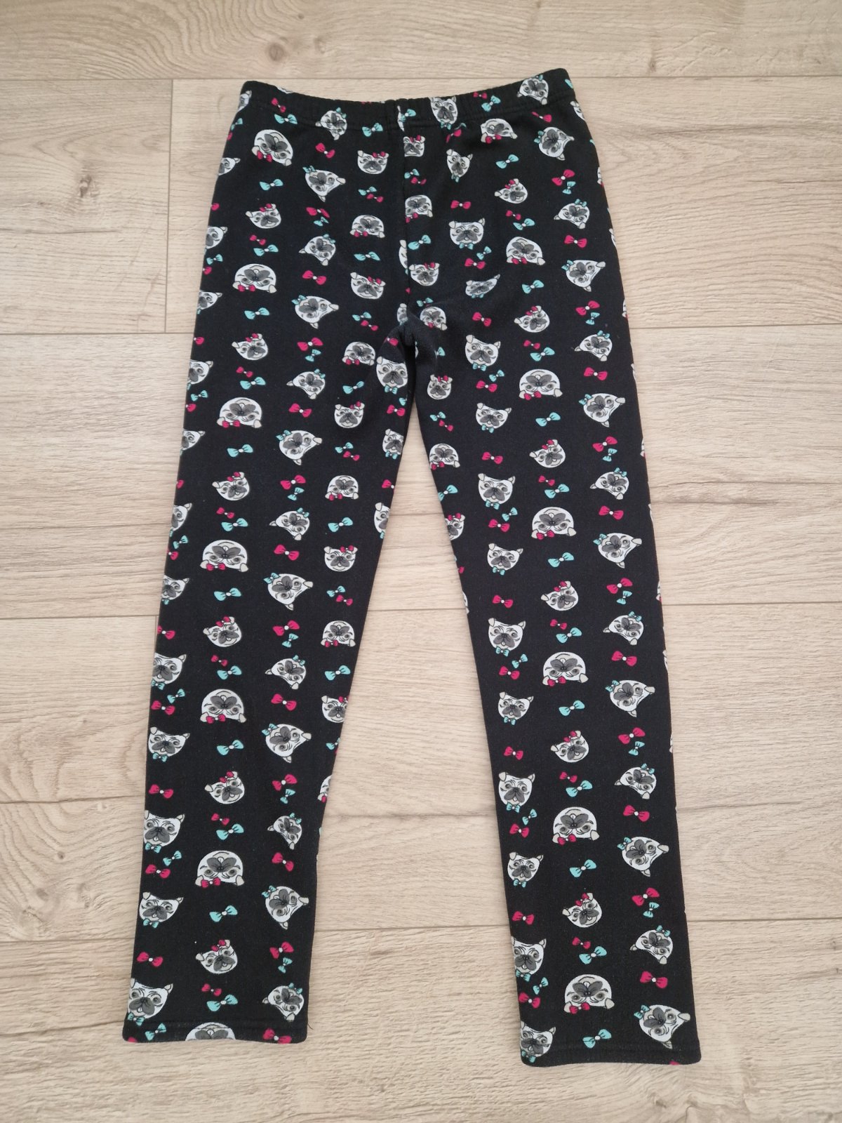 Cierne teple leginy na von, doma. Motiv psiky a maslicky. Pas 62cm, dlzky cca 83/58cm.
