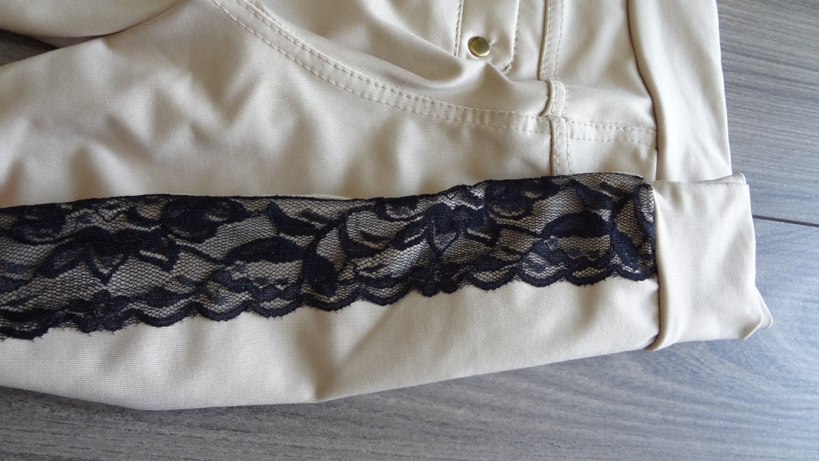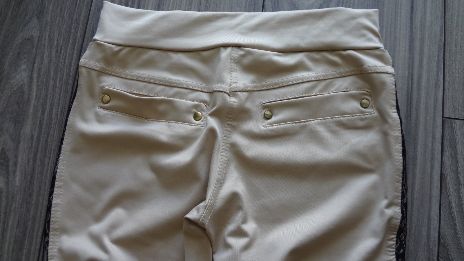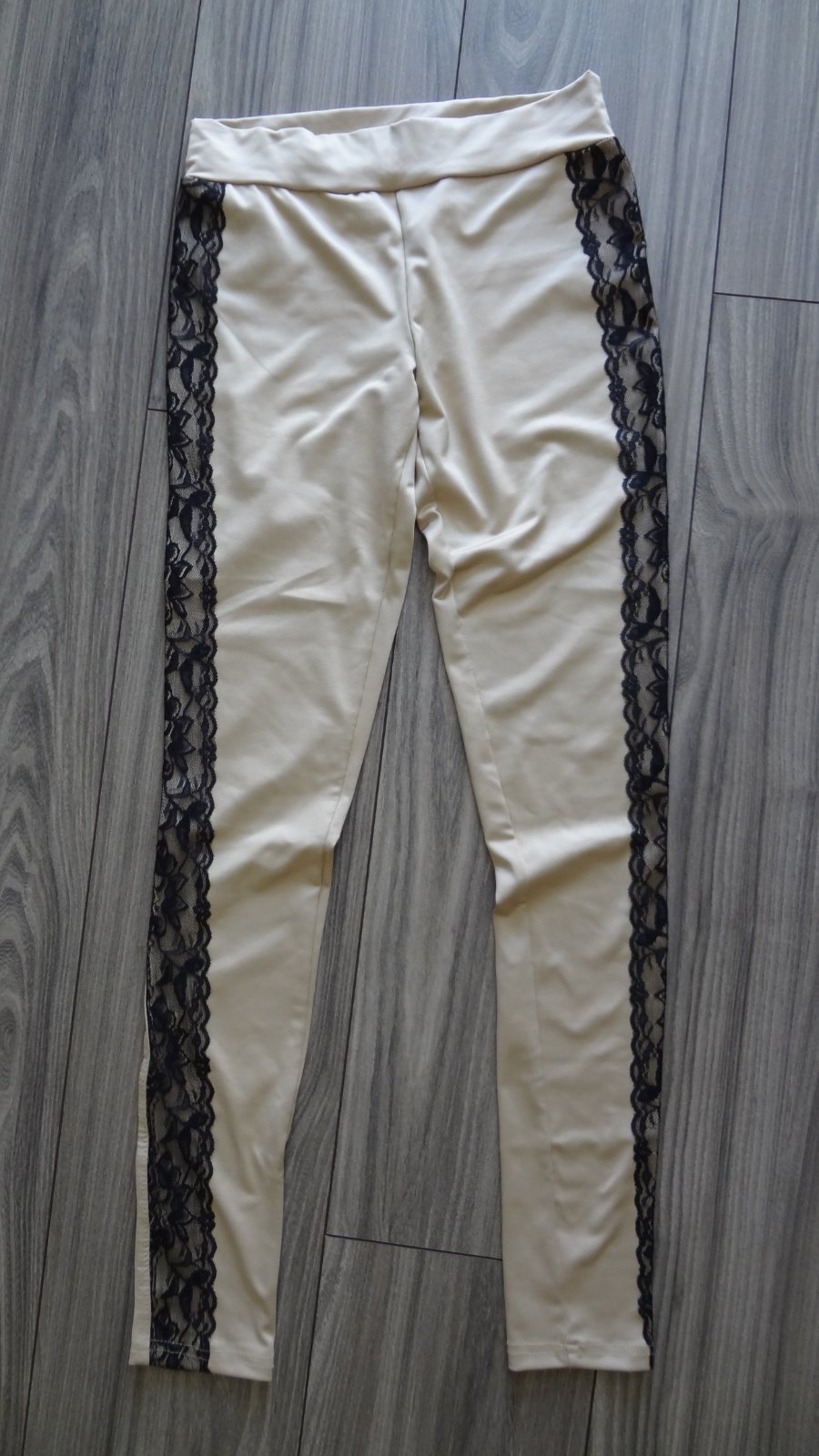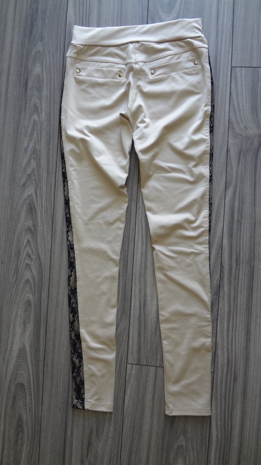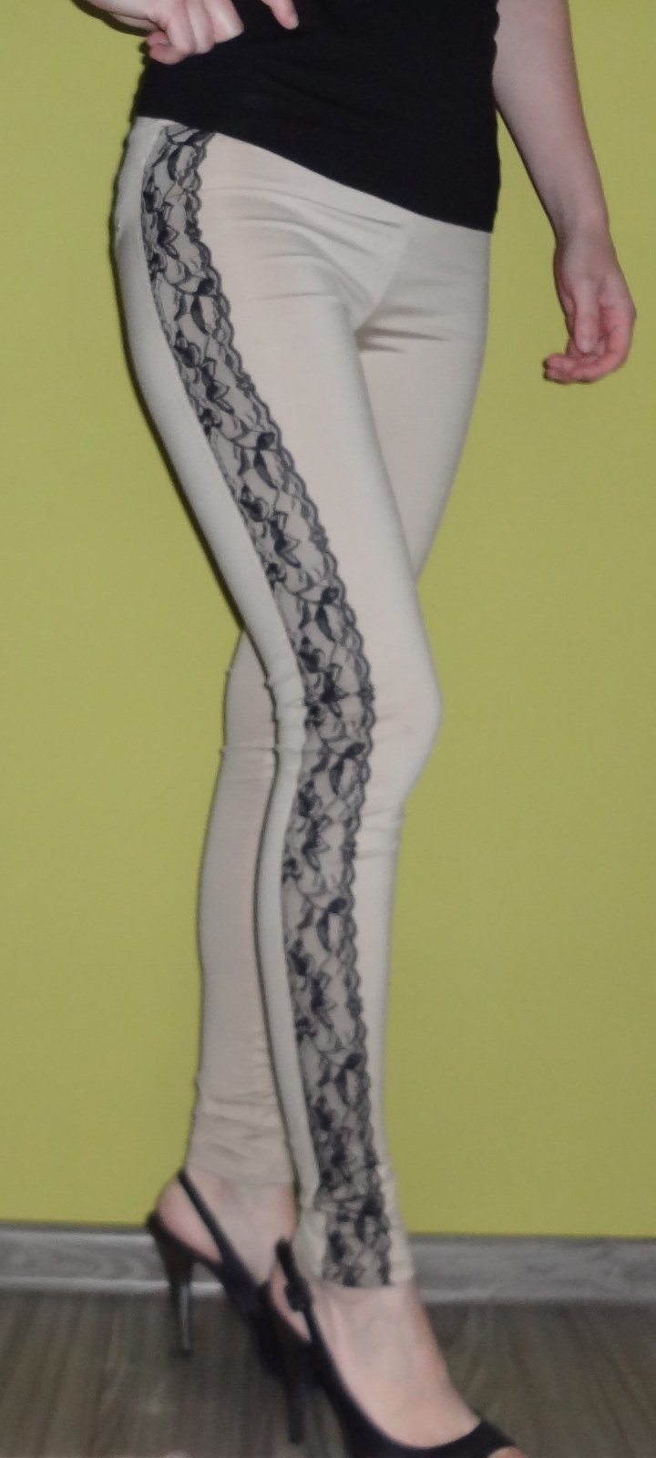 Predám legíny s čiernou čipkou na boku, veľkosť XS. Legíny sú elastické, lesklá telová farba na boku čierna čipka po celej dlžke. Vrecká sú imitované.