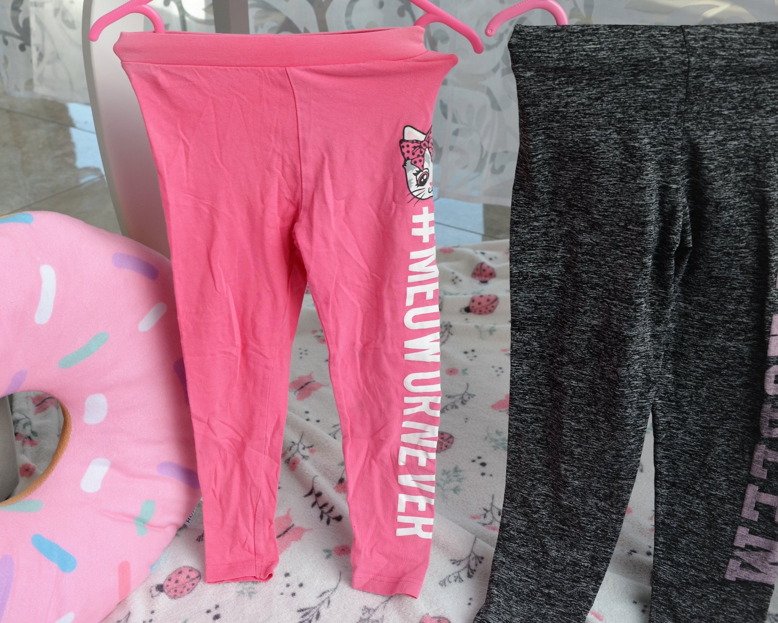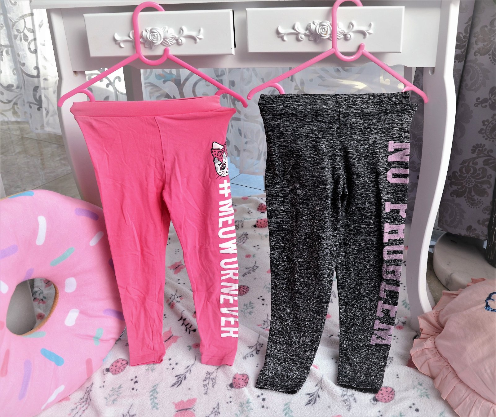 nevymieňam!!cena za obe!!predaj len spolu!!mačičkové-bavlnené,pár x oblečené,tenké,vhodné na jar,dĺžka 56cm,pás v kľude 2 x 22cm,na kolienku modrý slabý fľak,mal by ísť dole-zohľadnené v cene.,druhé sivé-nápis trochu vyblednutý praním,dĺžka 61cm,pás 2x 20cm,veľkosť 104/110.kuk aj na iné moje inzeráty