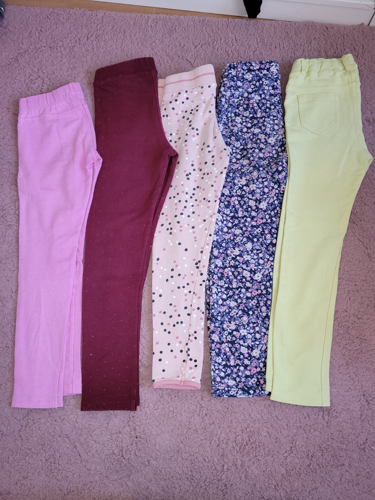 Ružové pepco dĺžka 67cm grátis, bodkované pepco dĺžka 66cm grátis, ostatné H&M, bordové 73cm kvietkované 70cm, žlté 71 cm, cena za kus 2 eura, pri viacerých zľava. Legíny sú hrubšie, nie tie klasické tenké legíny.