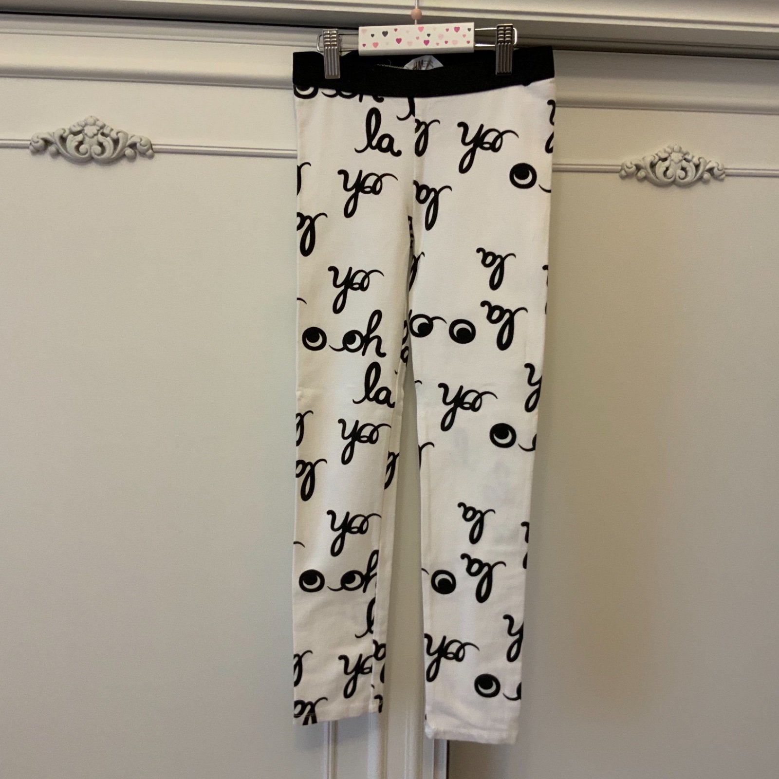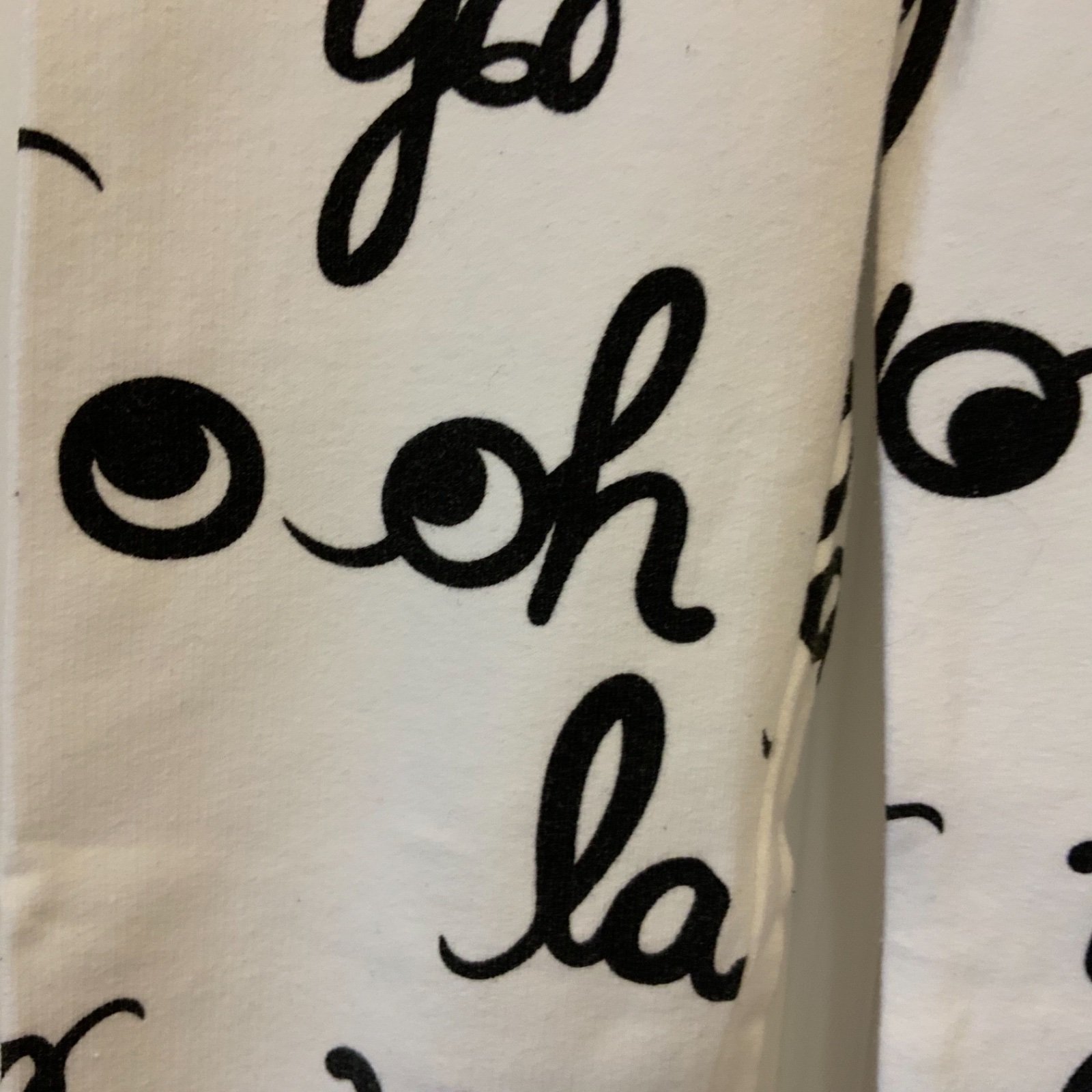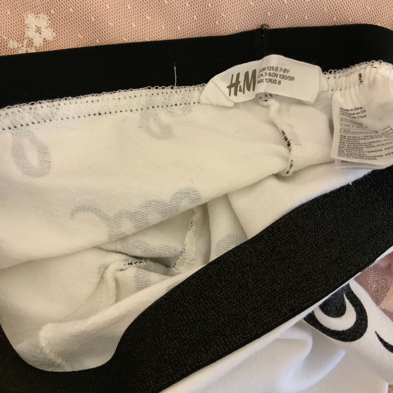 Hrubšie legínky H&M č. 122/128, 7-8 rokov, v topstave, dcérka mala max. 2x, už sú jej ltt. Sedeli jej ako 116+-122/128. Farba biela so zamatovými čiernymi nápismi.