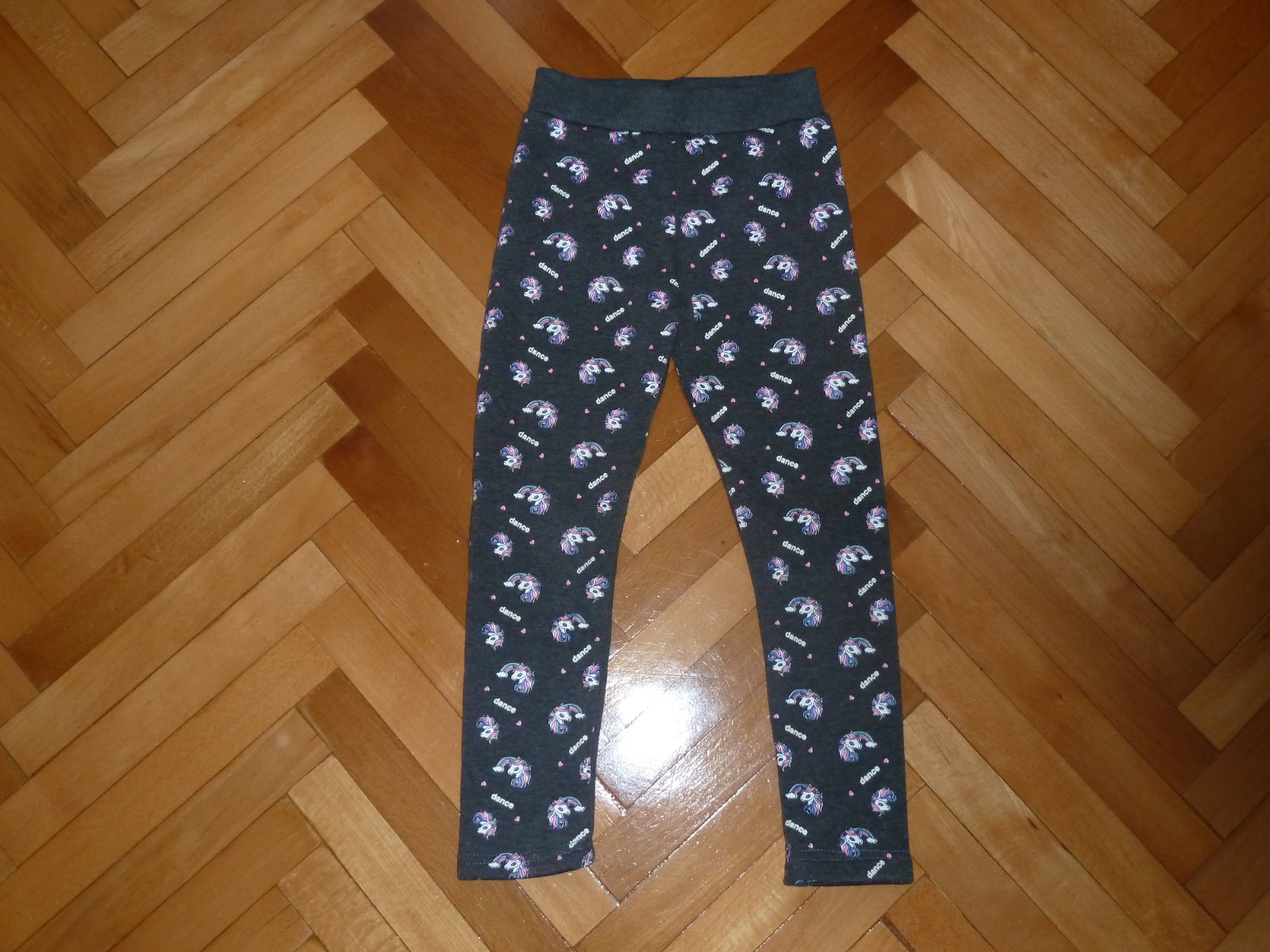 Flisom zateplene leginky s konikmi v top stave, par krat oblecene, kupovane nove, velkost 128.