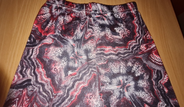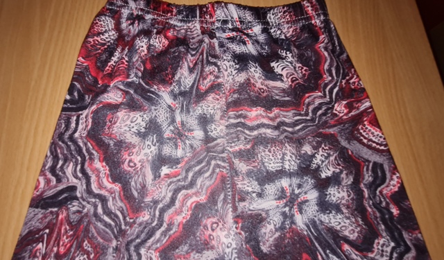 vzorované, červeno - hnedo - sivé, na kolenách a zadku ošúchané, medzi nohami sú už voľnejšie nitky, ale nie rozpárané, legíny ešte dosť vynosíte, zloženie bavlna + polyamid + elastan, dobrý stav