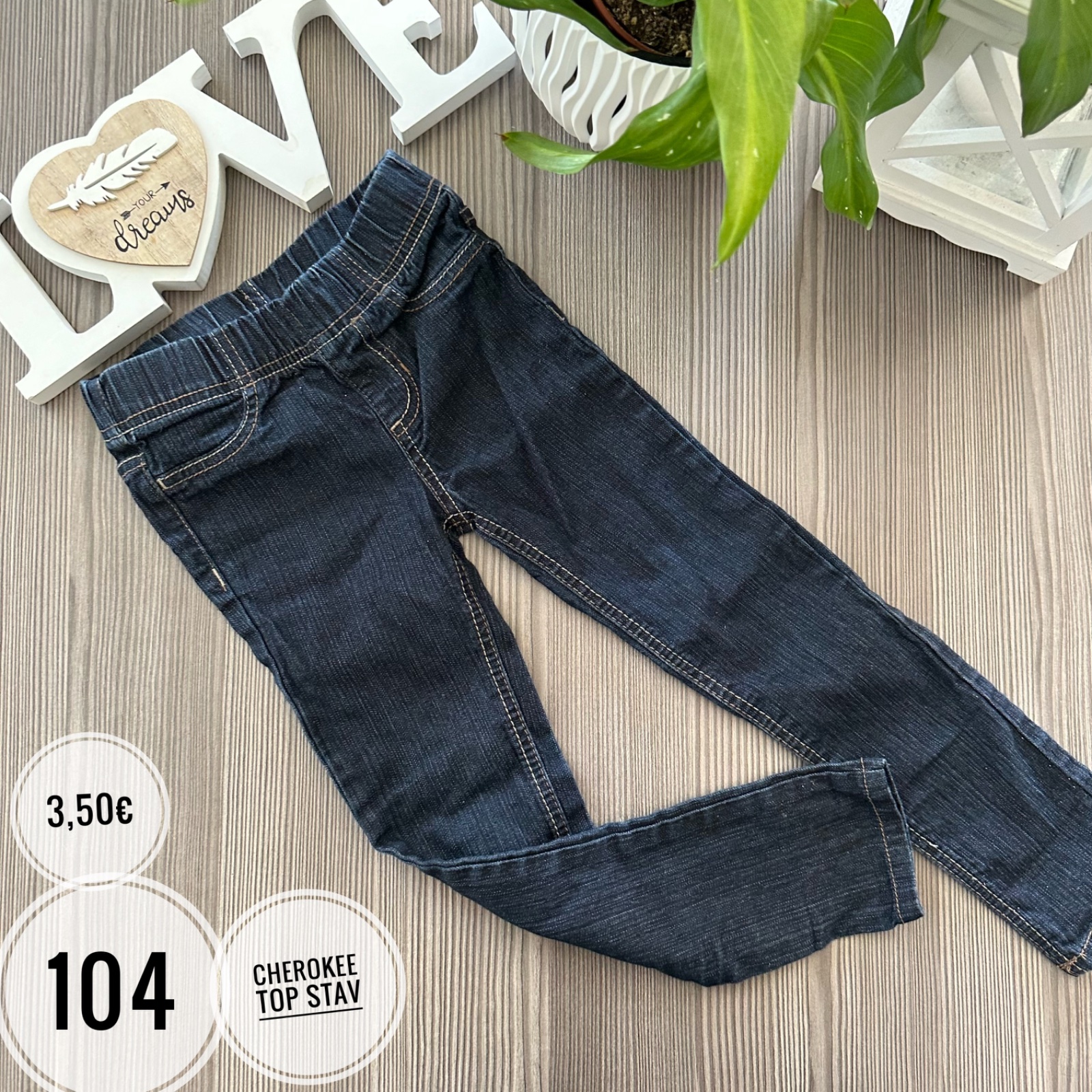 Top stav, nenosene, neprane. Nadherne dzeginsy, setrili sme.ich, az boli male, takze sme.nestihli vobec vynosit. Su to take akoby leginove nohavice, material nieco ako bavlnena riflovina s elastano...