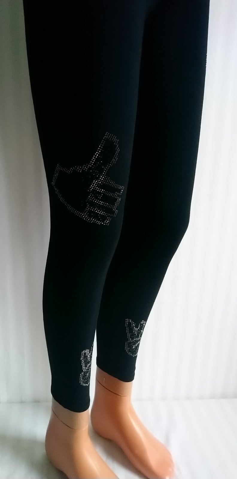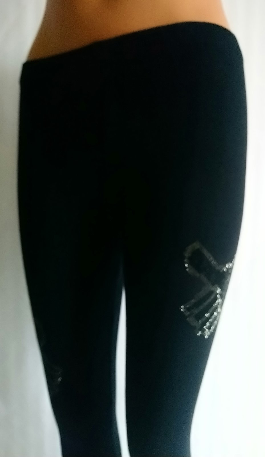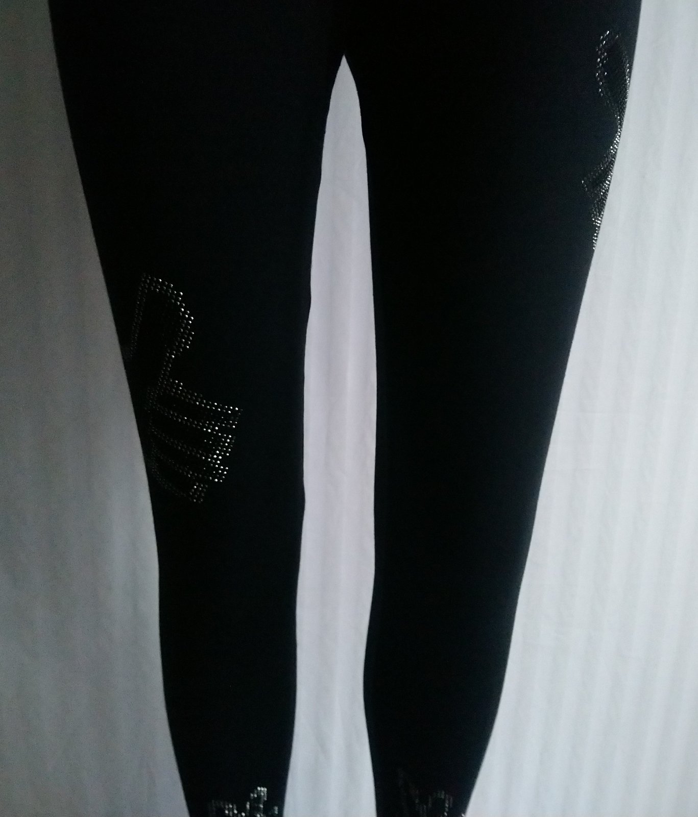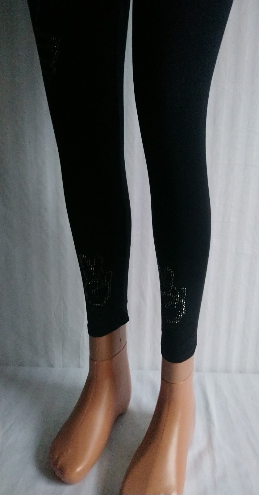 dámske čierne elastické legíny ozdobené kamienkovým motívom na stehnách a dole, v páse na gumu,