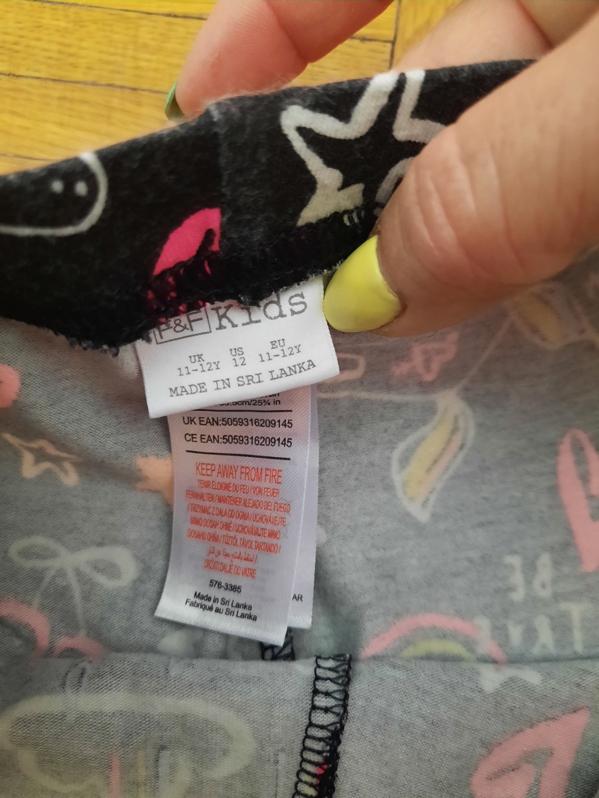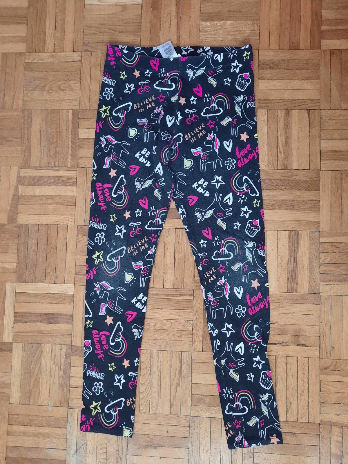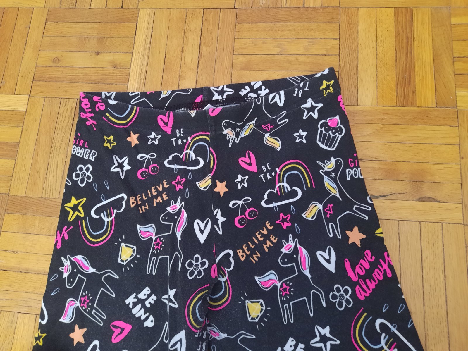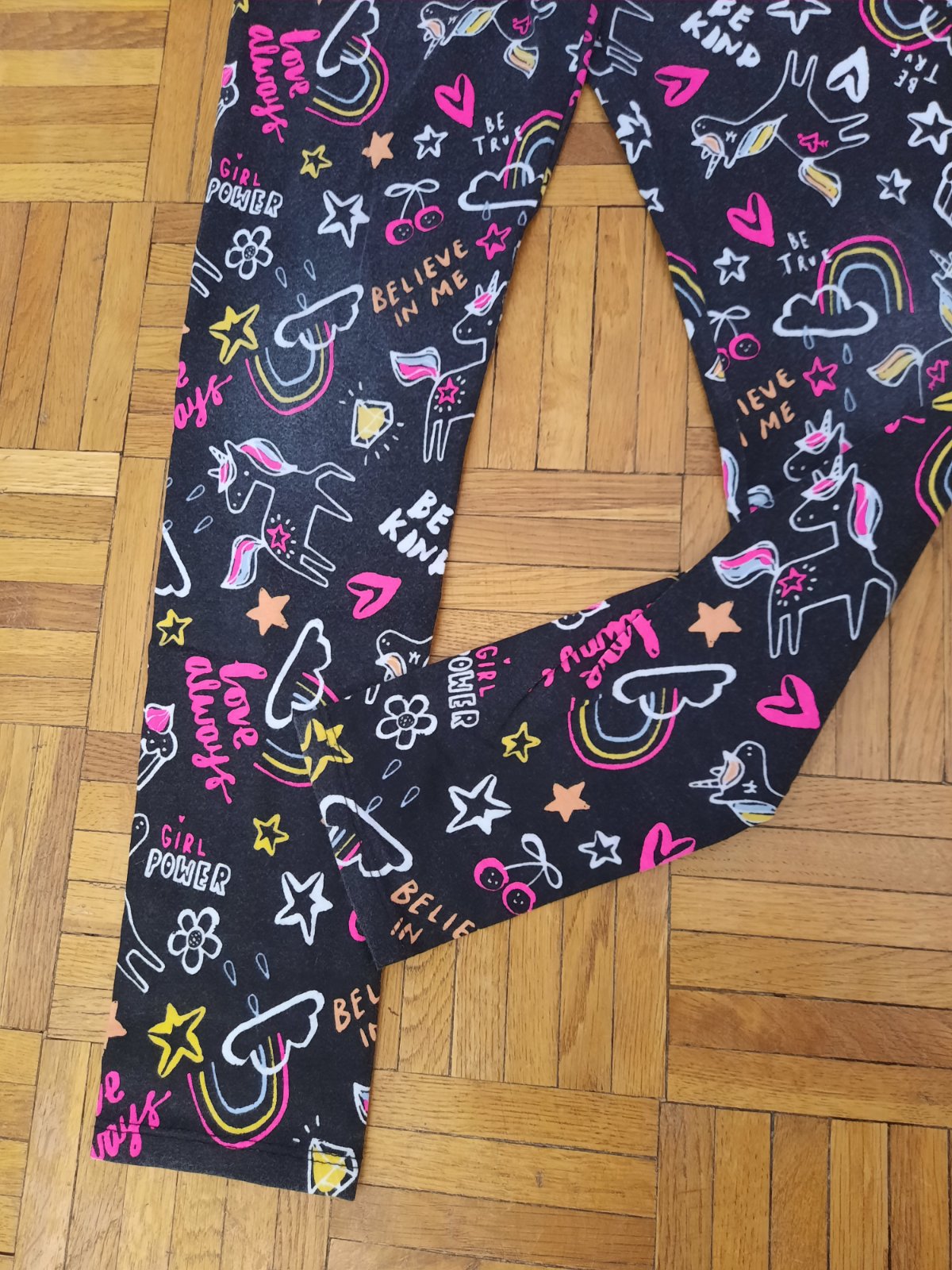 Bavlnené leginy v top stave bez poškodení rozmery dĺžka 82 cm vnútorná dĺžka 63 cm pás v kľude 30 cm natiahne sa na 39 cm Trblietavé s Potlačou dúhy T1377K88788