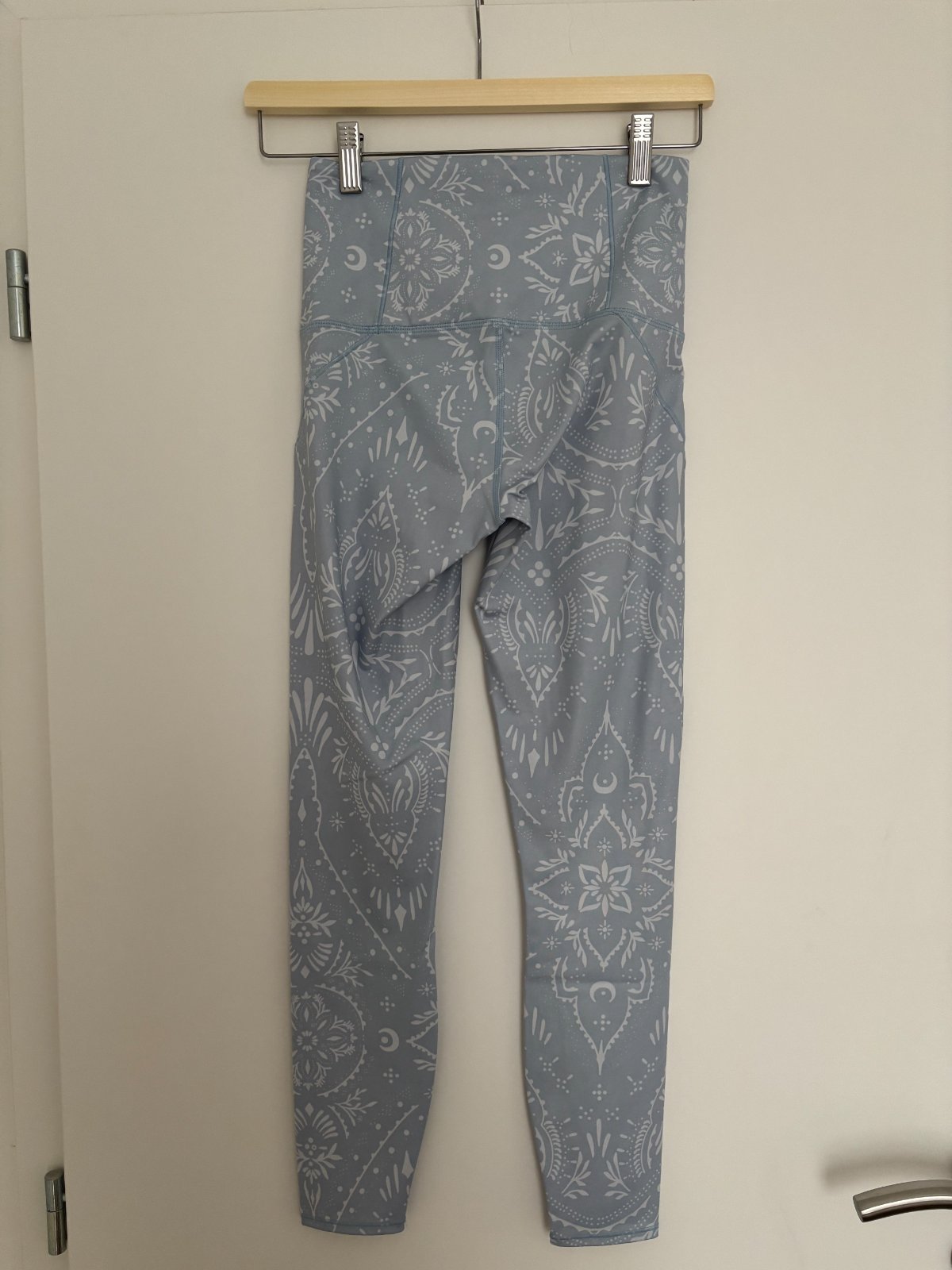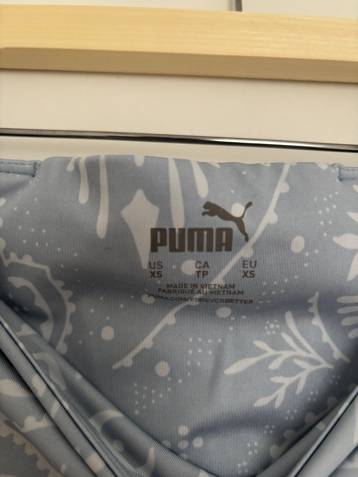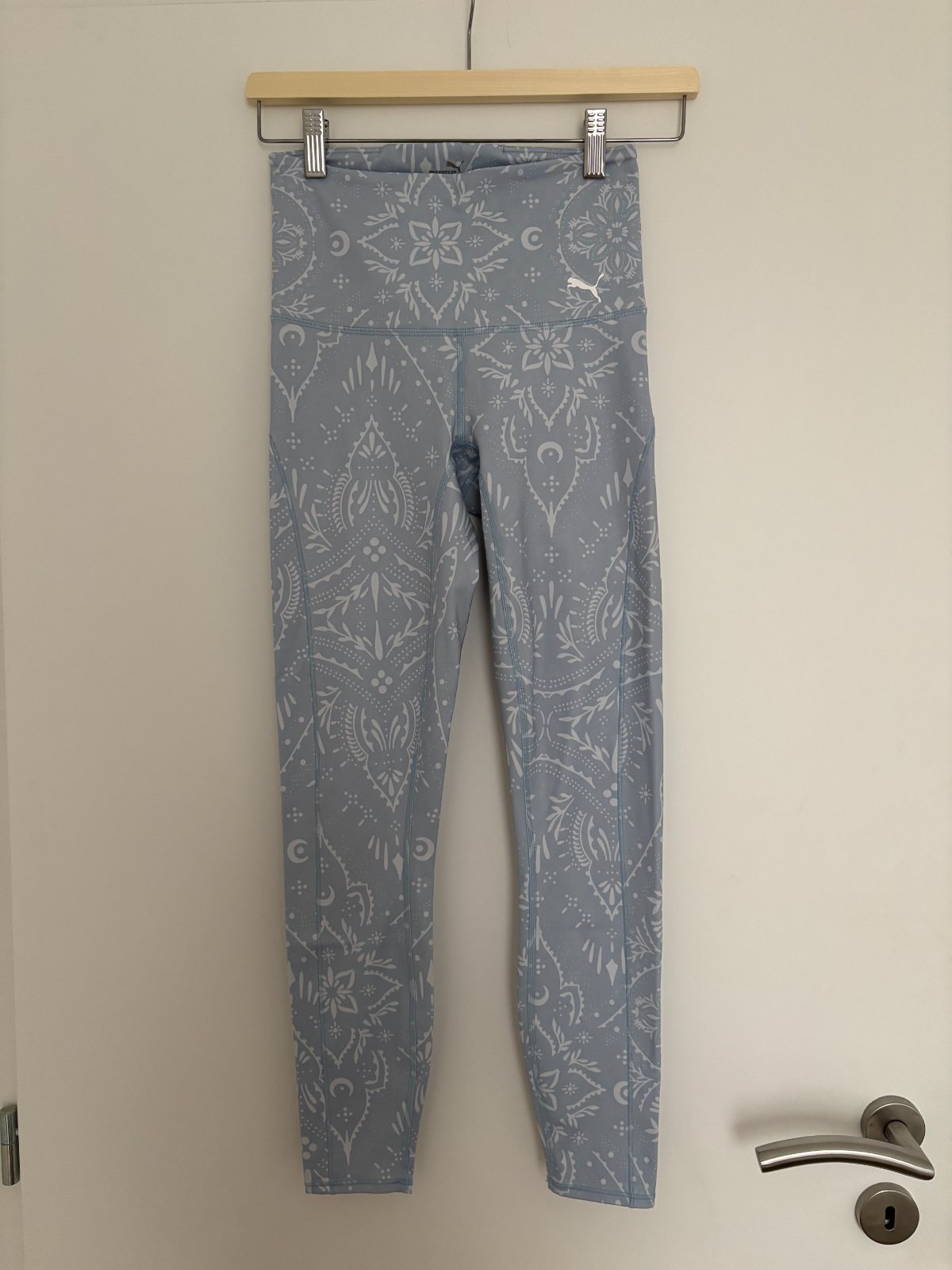 Yoga športové bledomodré vzorované legíny značky Puma s vreckom na zadnej časti, veľkosť XS, bez poškodení a známok nosenia. Osobný odber je možný v BA a NR.