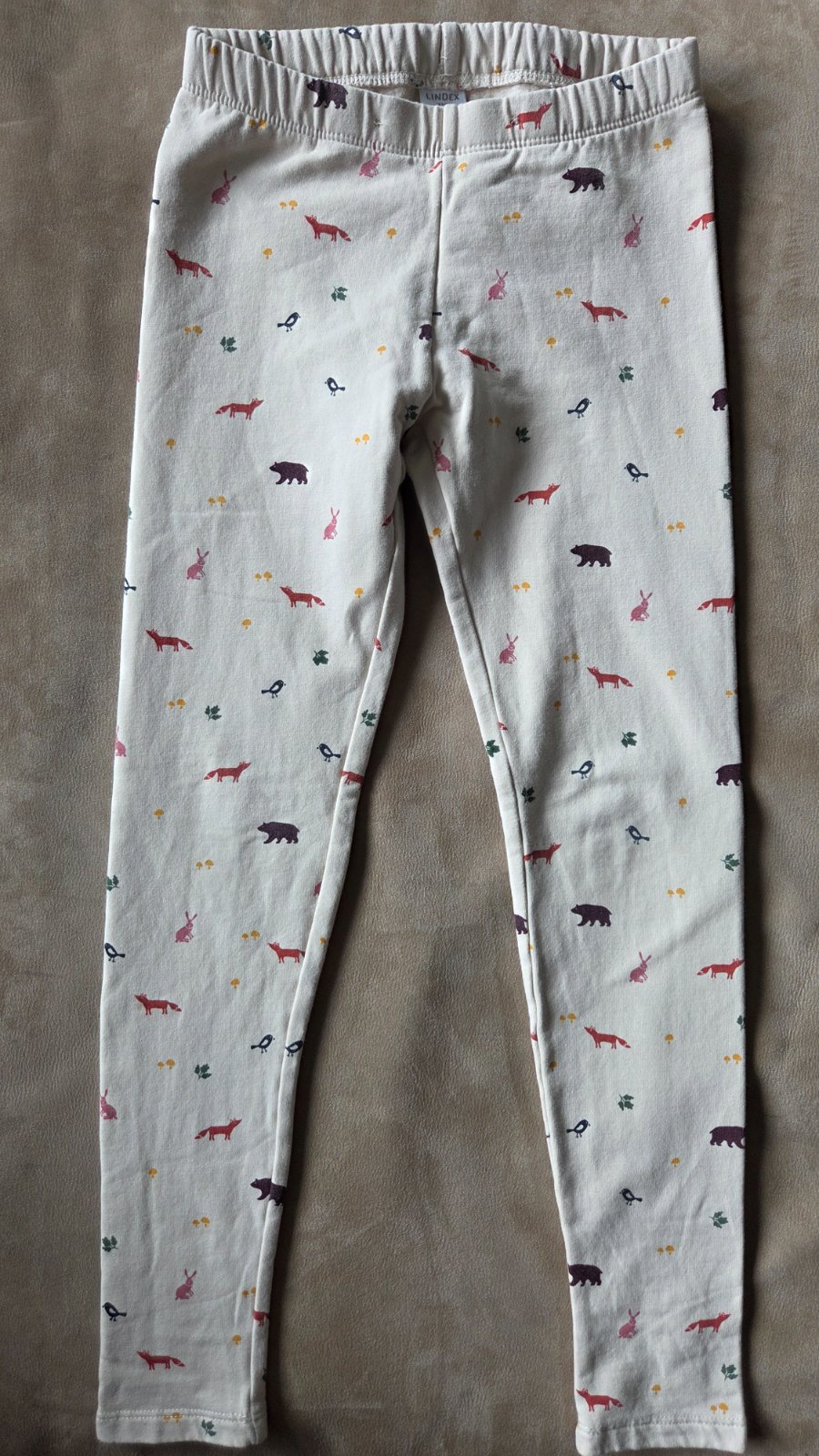 Bavlnené legíny s česanou vnútornou stranou, krásna potlač lesných zvierat, zn. Lindex, pás sa dá regulovať, veľ.128, super stav, asi 2xprané. Celk.dĺžka 74cm.