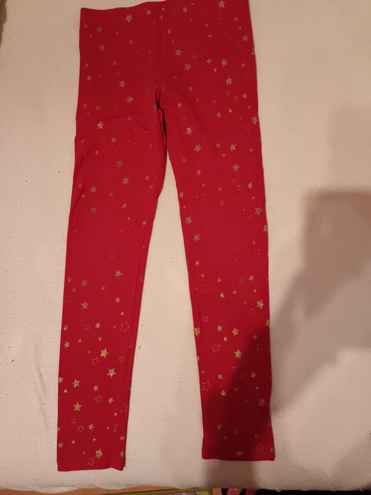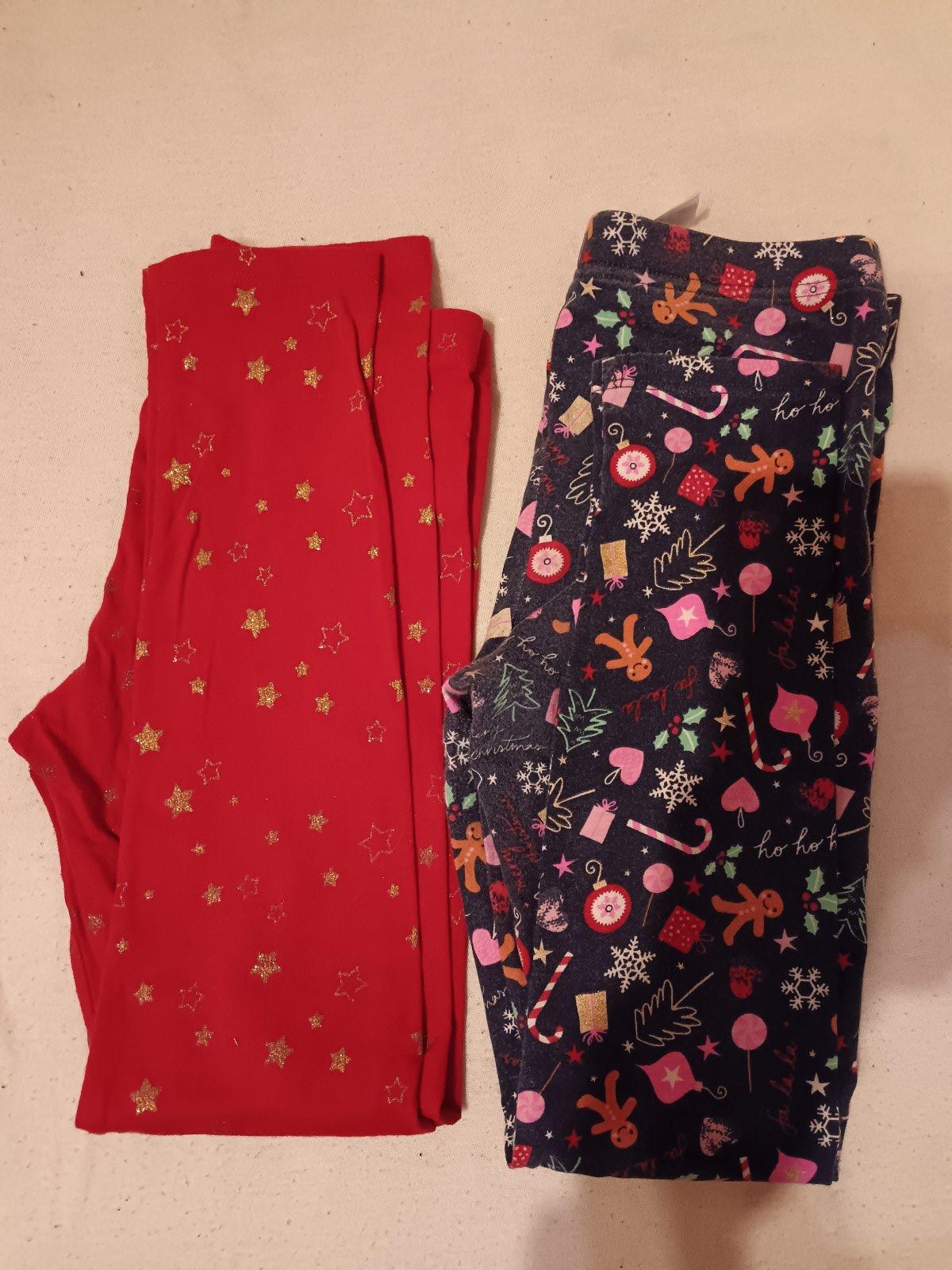 Nosené vianočné legíny. Modré sú nosené viac, nosenie je vidieť na kolenách, majú aj malé zmolky medzi nohami, farba vyblednute z prania. Na červených je vidieť nosenie na kolenách. Modré 2€, červené 3,50€, spolu 5€.