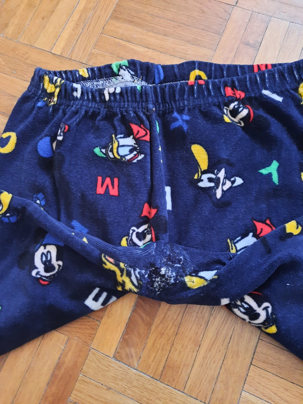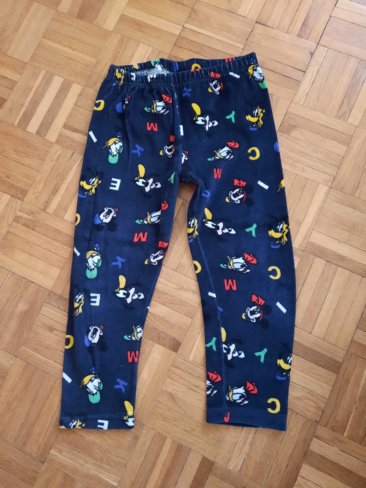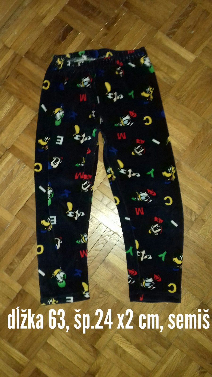 Predám detské legíny tmavomodrej farby z hladkého semišu (zamat), so vzorom káčera Donalda a písmen. Sú zašité medzi nohami. Veľmi príjemné, trošku hrubšie.