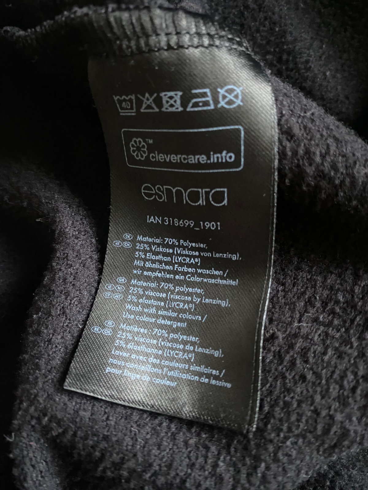 100 percentný stav, kvalitne, zloženie polyester + viskóza + elastan, teplo podšité, veľkosť písma na XL, Sedí na 42 a kľudne aj 40