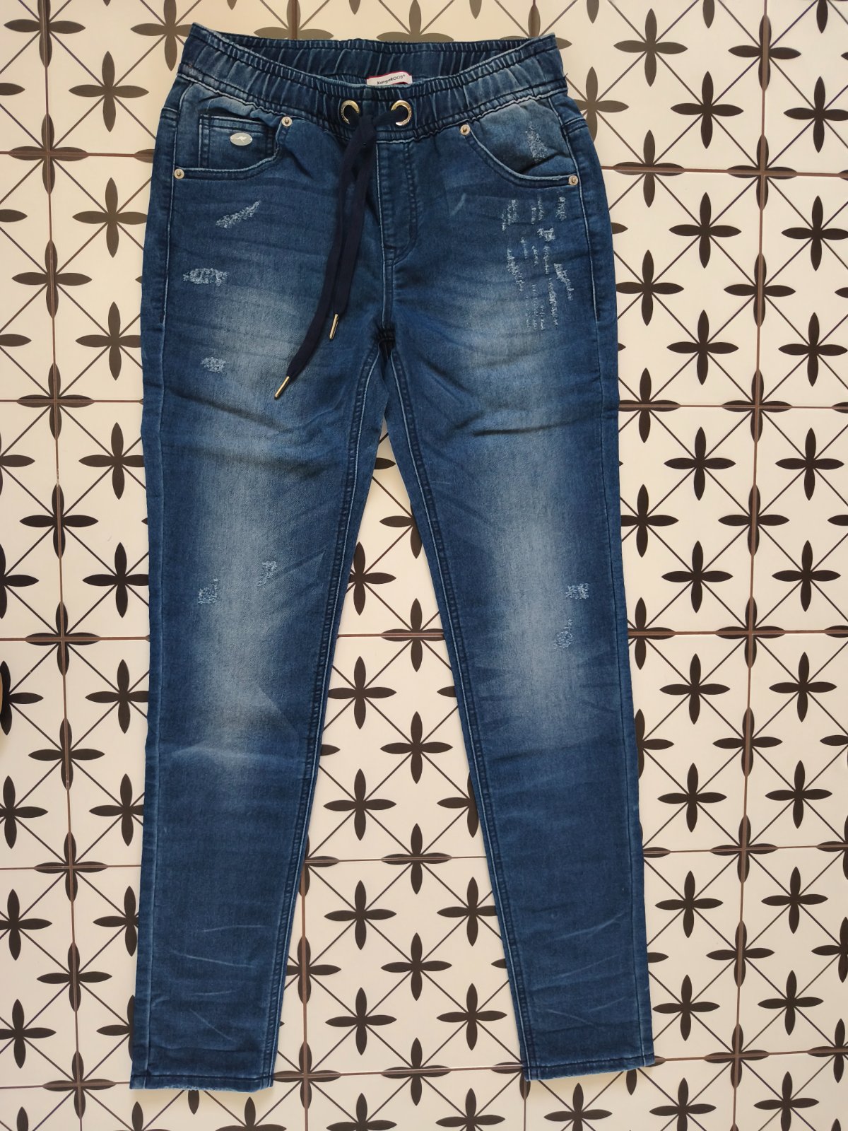 Rifle, voľný strih, veľkosť Xs, tenká riflovina, farba a vyšuchanie je bledšie než na fotke, pas na gumičku, možno stiahnuť aj šnúrkou, po bokoch vrecka, na zadku falošné vrecka, nosené minimálne, ...