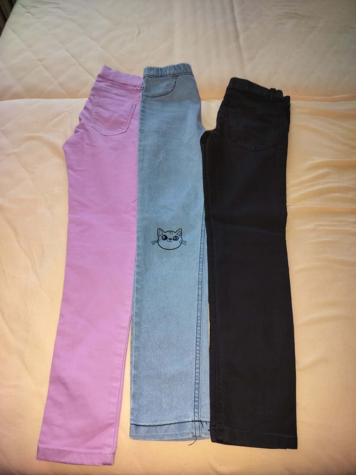 Predám riflové džegíny, píše väčšiu veľkosť ale mala nosila medzi 128-134 potom už jej boli malé ružové čierne bez poškodenia modré macickove pridám zdarma možno pôjde vyprať mierne fliacky na kolienku.