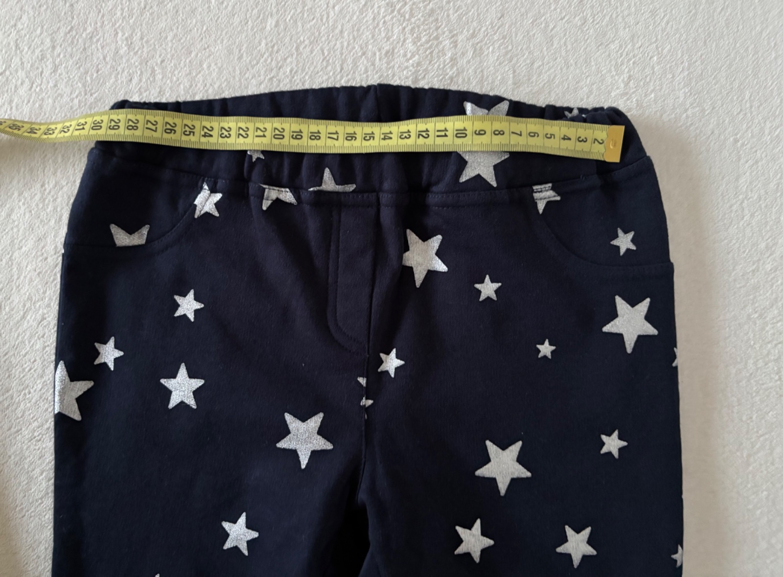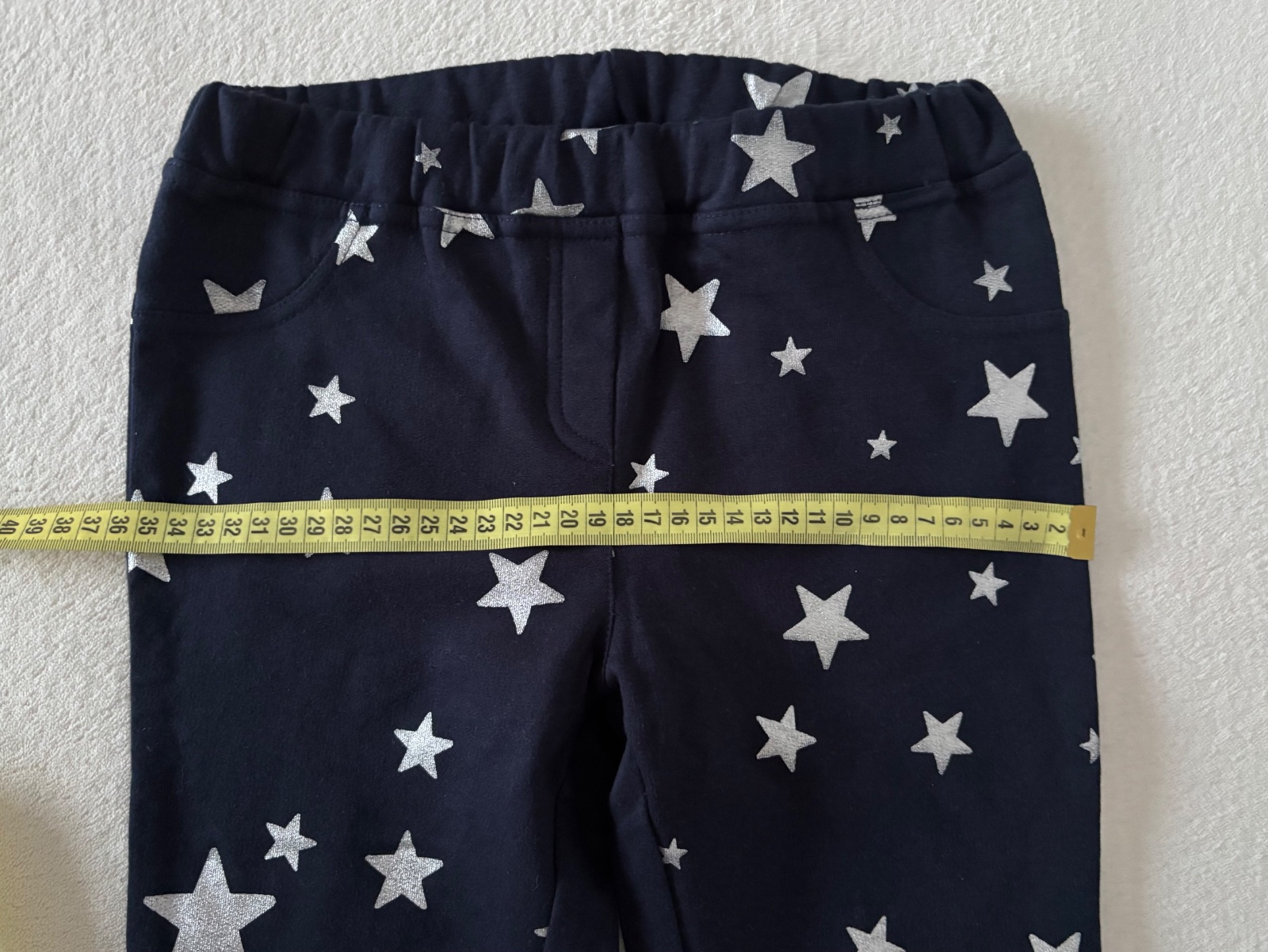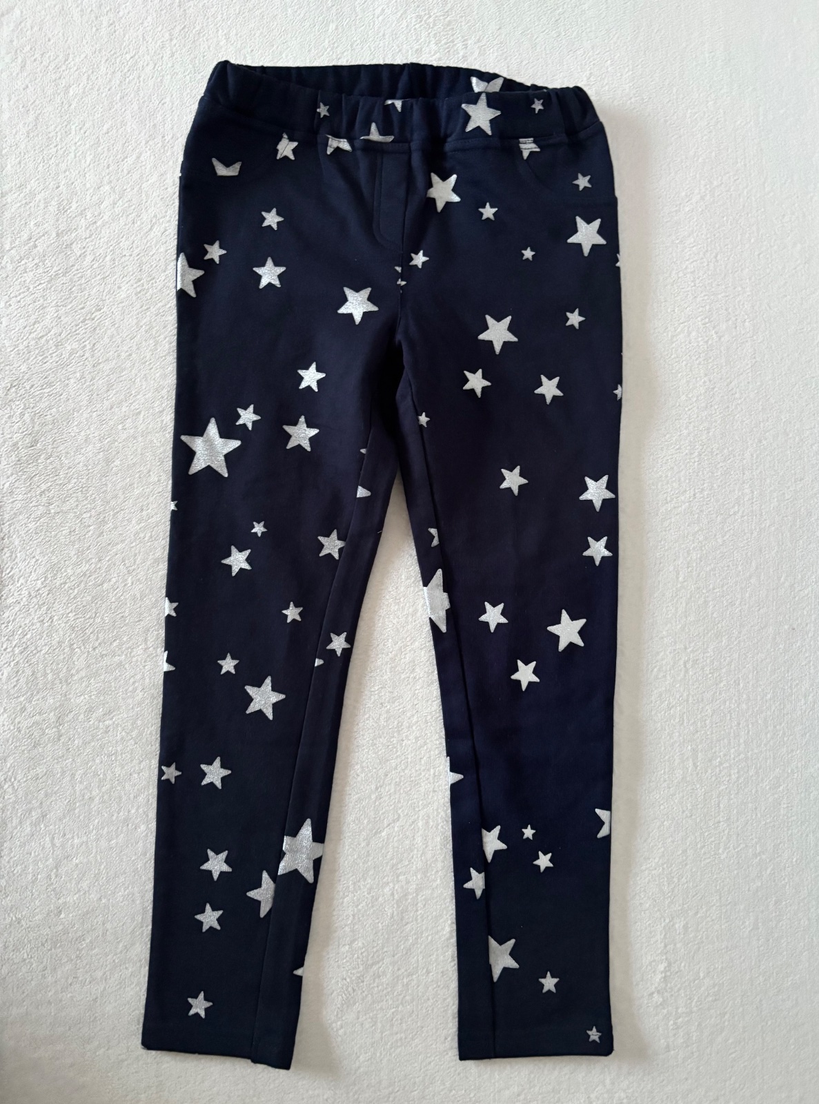 Ponúkam krásne nové mäkkučké termoleginy vpredu s falošnými vreckami, vzadu s ozajstnými vreckami. Dĺžka sedí na 128/134, ale mojej 21 kilovej dcére sú široké na zadku. Rozmery na fotkách. 100% bavlna