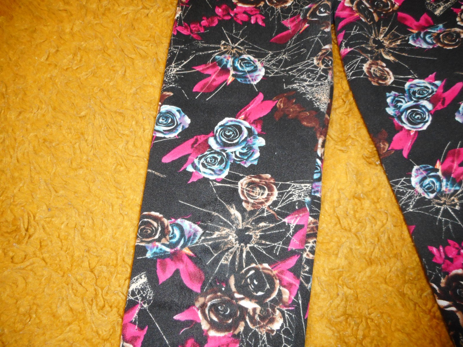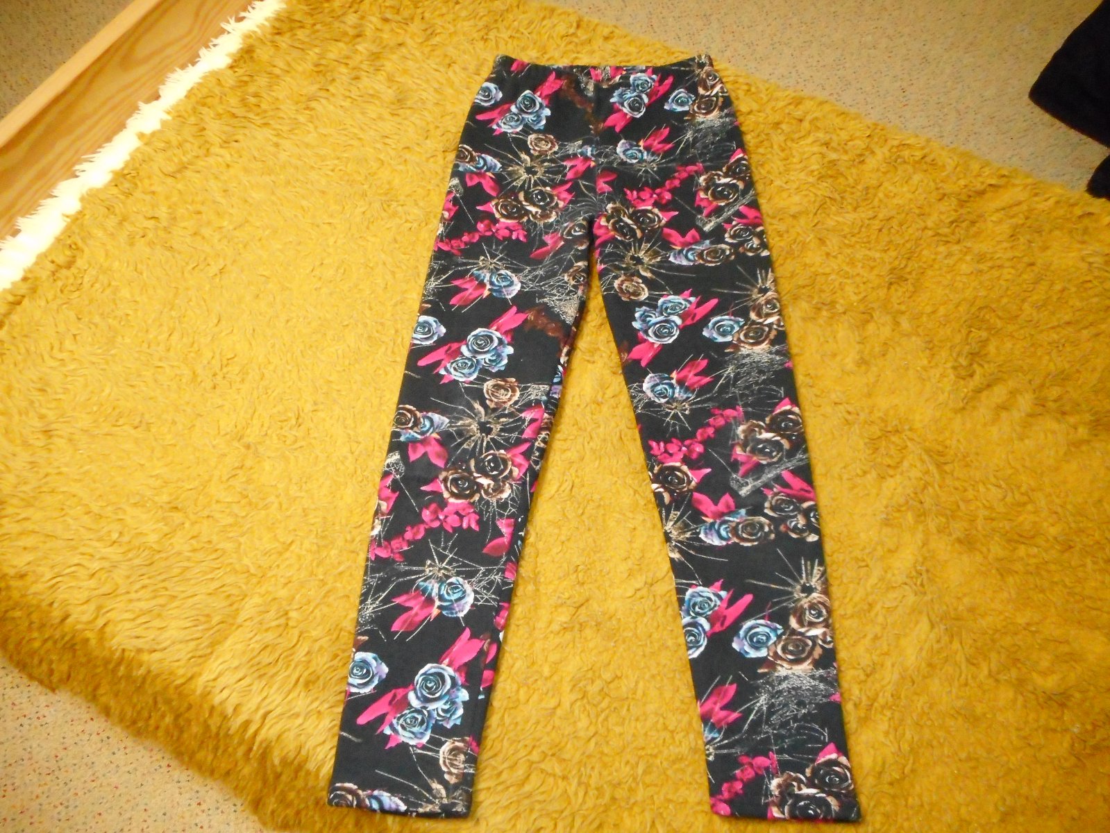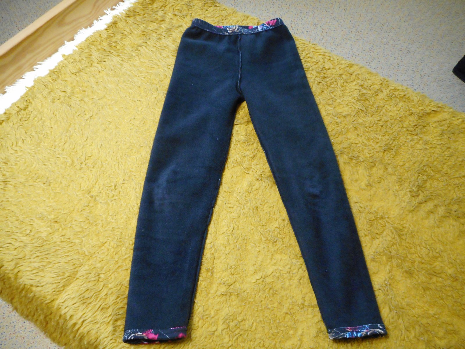 predám používané, nepoškodené dievčenské zateplené legíny, podľa štítku na veľkosť 146/152cm, reálne tak 134cm čiernej farby s potlačou hnedých a bordových kvetov a iné, pás gumičkový v kľude 28cm, celková dĺžka legín je 82cm