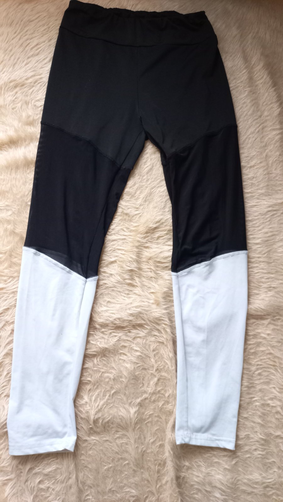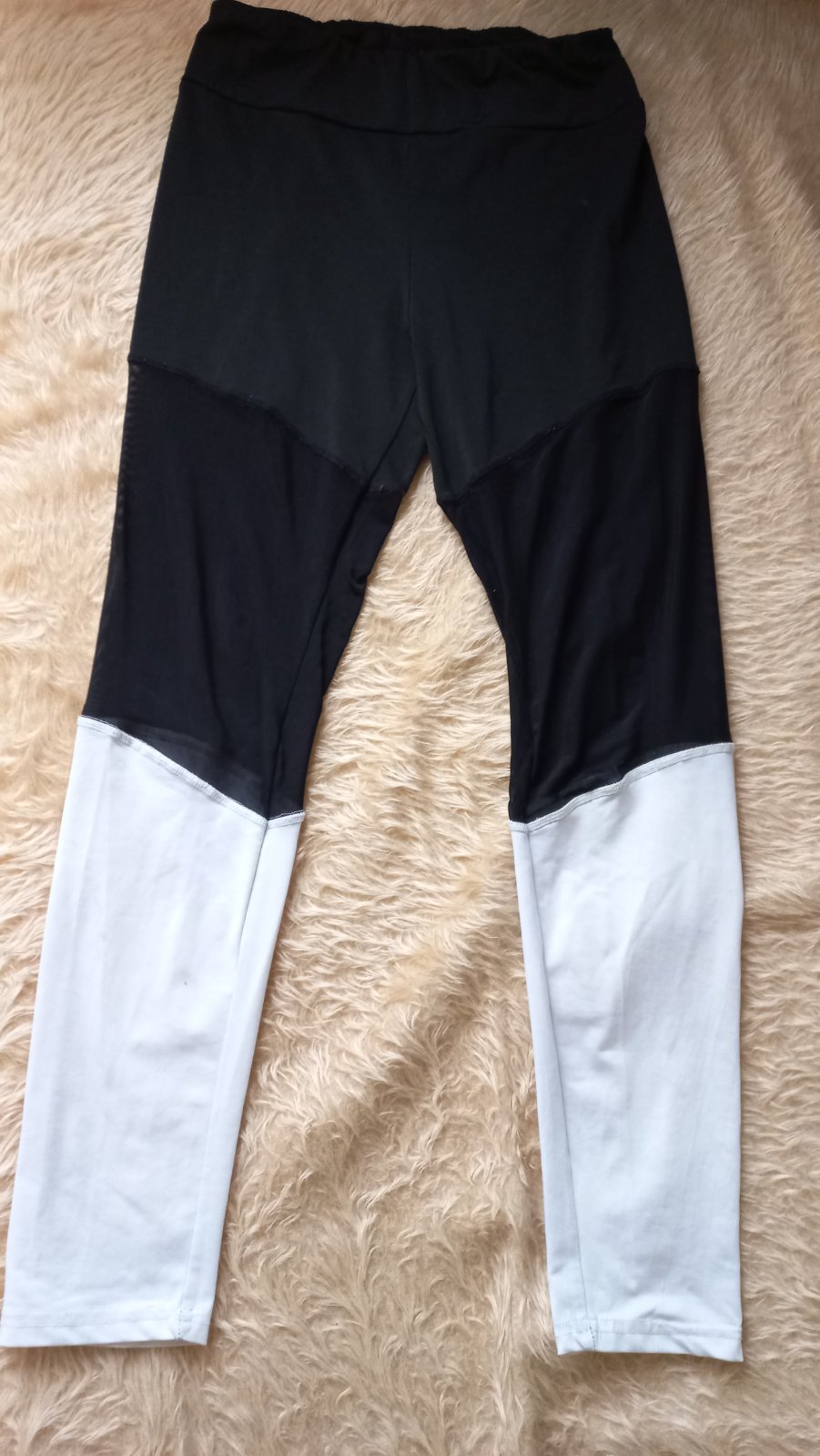 Dámske legíny z troch čast , stredná časť je priesvitná. Na bielej častí majú 2 malinké bodky. Vid foto