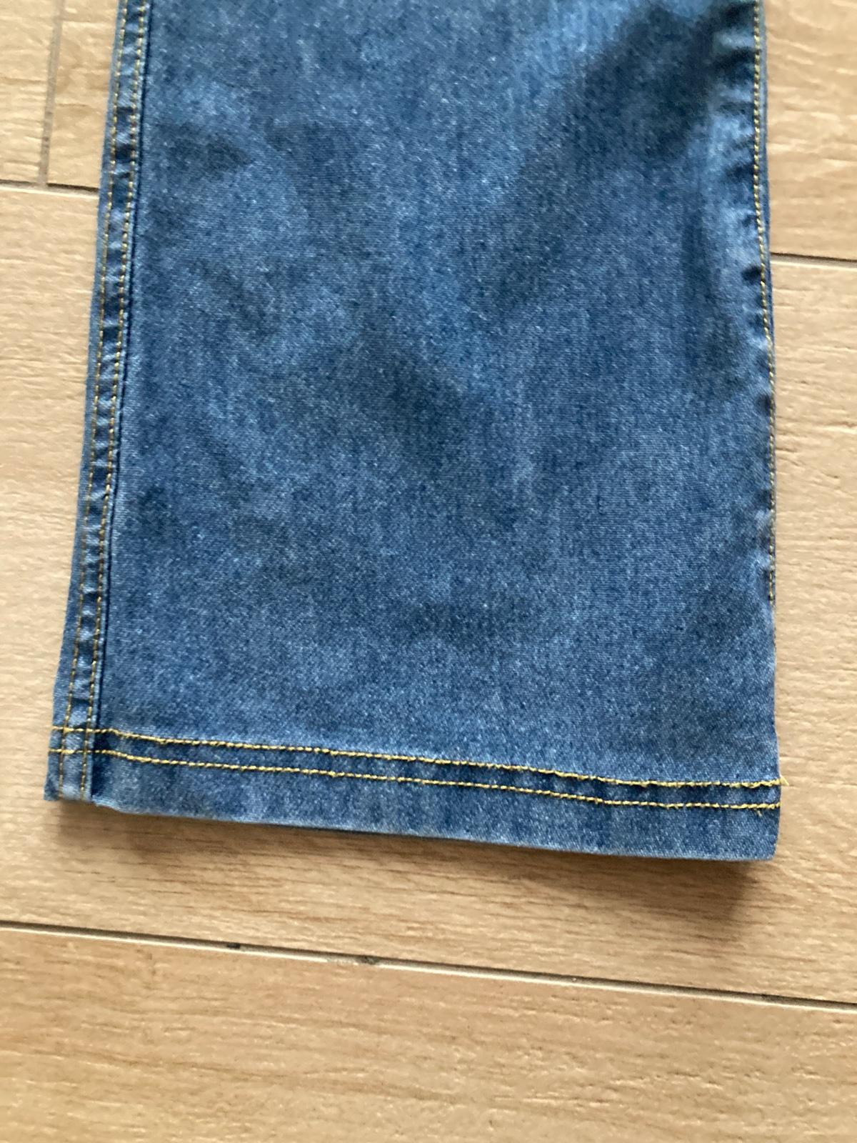 Bez poškodení, mäkké, elastické, vzadu dve vrecká, obvod pásu v kľude 62 cm, bočná dĺžka 88 cm, od rozkroku nadol 71 cm.