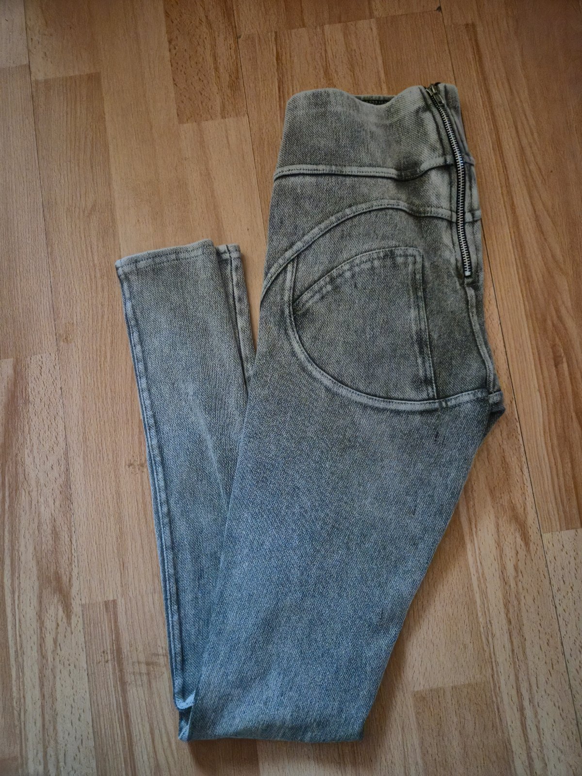 Predám pekné šedé push up legíny zo zipsom,maju sem tam zatrhnutú látku také trhlinky viď foto,vel.XS,značka Djuk,cena 8€ pôvodná cena cez 30€