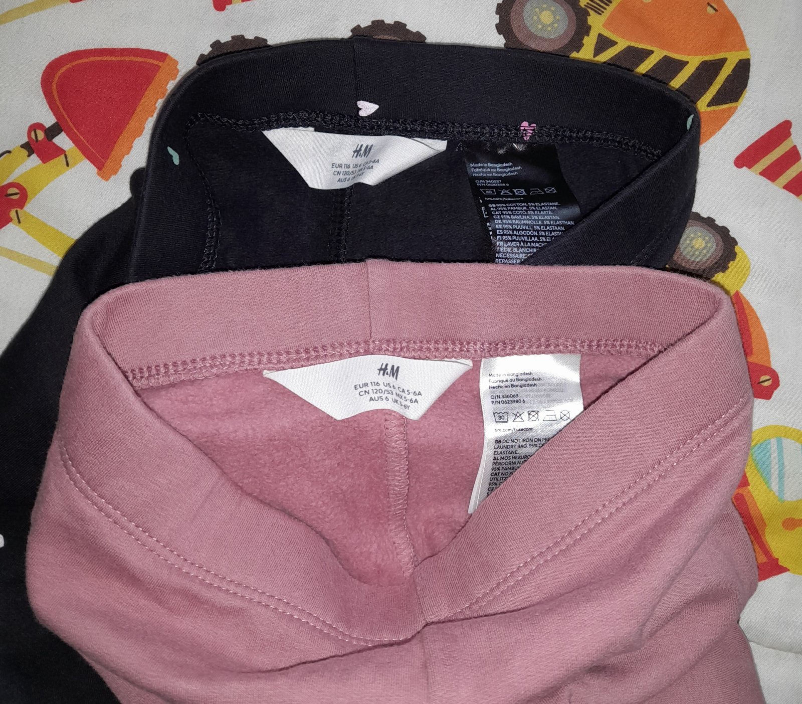 Zateplené legíny H&M veľkosti 116. Ružové mala dcéra 2x, srdiečka na kolenách sú trochu ošuchnuté. Čierne so srdiečkami mala raz, je na nich mini fliačik, neskúšala som ho odstraňovať.