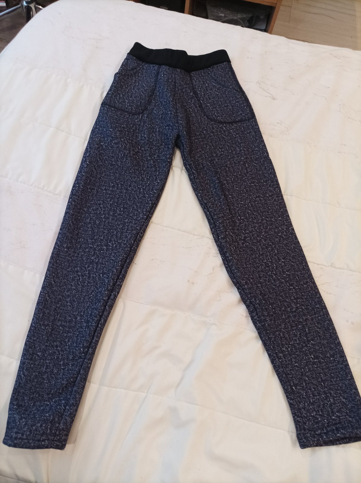 Druhý a tretí kus sú legíny v tmavosivej farbe a v rozmeroch ako sú na fotkách. Jeden sedí zhruba na 8 rokov (veľkosť 128) a druhý kus na 9 rokov (veľkosť 134). Je tam visacka na 152/158 ale sú určite menšie, preto si pozrite rozmery. Rada premeriam ešte čo treba. 4€/1kus
