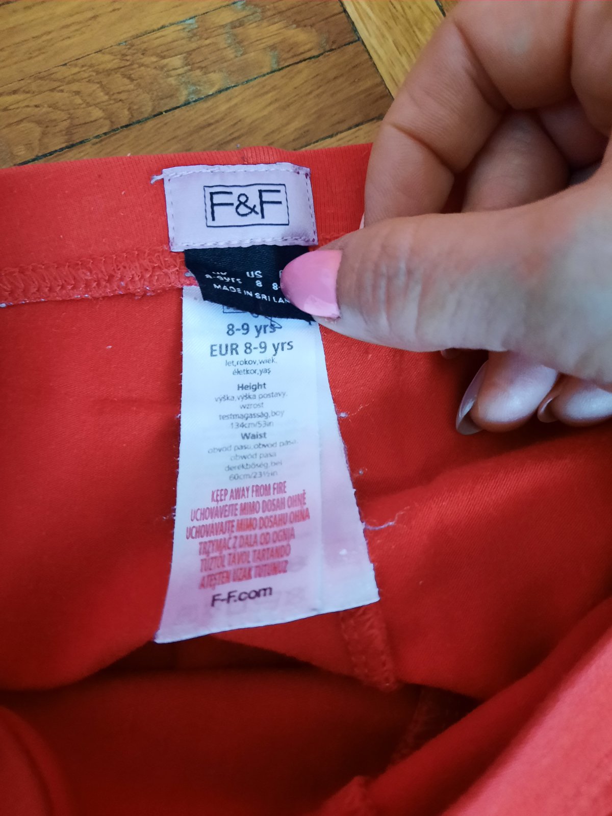 Jednofarebné červené sú V-134; zn. F&F, bavlnený materiál. Majú drobnú dierku v rozkroku (ešte zašijem 😉).