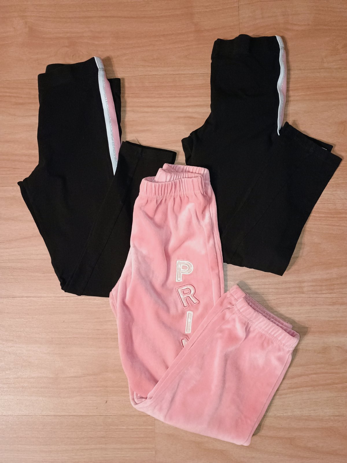 Krásne legíny, jedny čierne úplne nové, obvod pása max. 2x32 cm, dĺžka ružové 69 cm, čierne 70 cm pružné elastické. Cena za kus