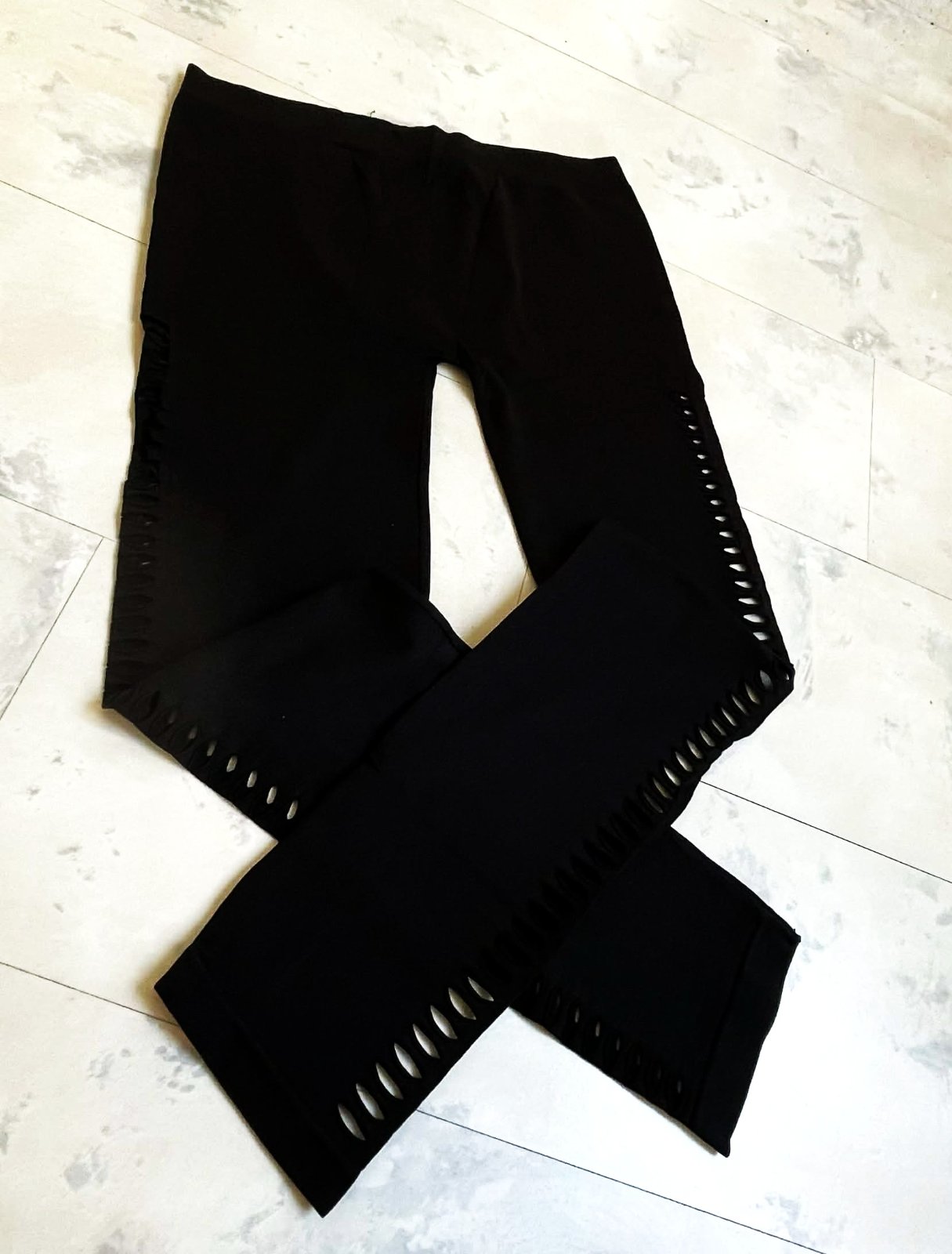 perfektné bezšvové sýtočierne legíny,na boku po celej dĺžke nôh dierkované,krásne zoštíhľujú,vhodné aj na leto ku tunike,ale aj inak - na voľnočasové a športové aktivity,veľmi zaujímavé a netuctové,v top stave,dlžka 80 cm, vnut. dlžka 57 cm,pás 40 x 2 cm ,ale až do 45 x 2 cm