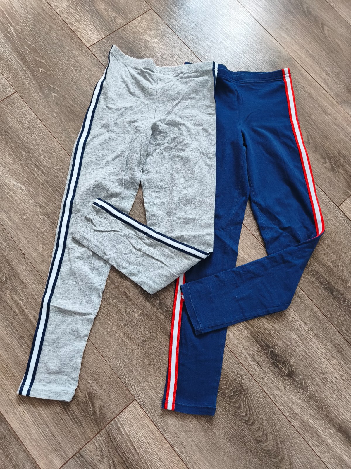 Bavlnené legíny s lampasom vo výbornom nosenom stave. Vhodné aj na telesnú výchovu. Uvedená veľkosť 134/140, ale reálne zodpovedajú skôr tej 134. 2ks - tmavomodré s červeno-bielym lampasom a šedé s...
