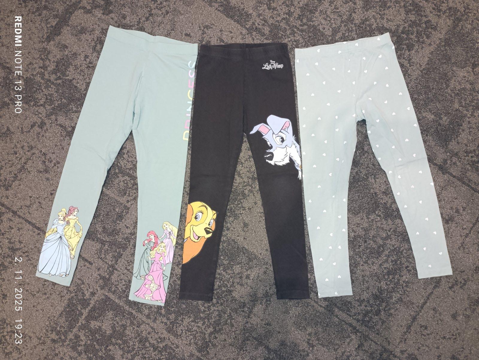 Dievčenské legíny Disney, veľkosť 128, málo nosené. Darujem k nim zelené legíny so srdiečkami (majú dierku, viď foto).