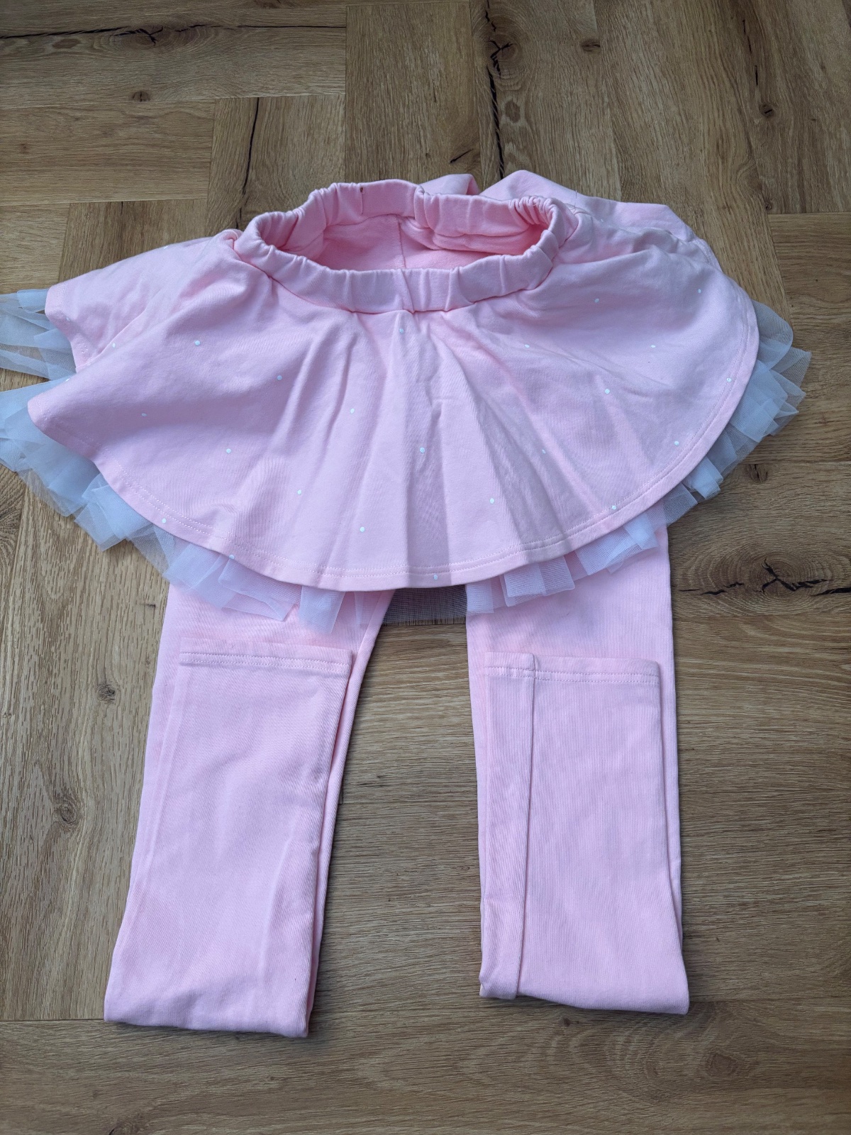 Krásne dievčenské legíny s tilovou sukničkou v bledoružovej farbe s bielymi bodákmi na sukničke v top stave-značka ZUPPA.Oblečené iba jedenkrát.