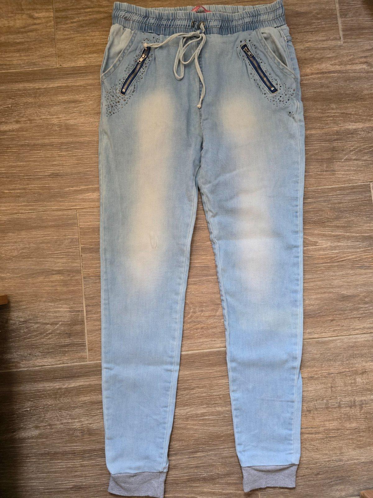 Predam rifle s jemne potrhanym motivom.zipsy imitačne, elasticke,velkost M.v pase guma Pas sirka 38,roztiahne sa na 44,je na gumu Predna dlzka 102,zadna 105 cm Ako nove,par krat oblecene.