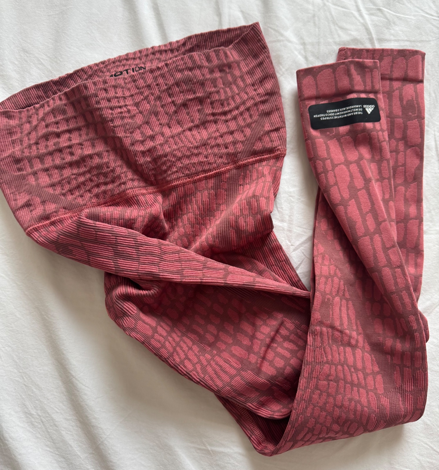 Športové elastické legíny, veľkosť 36/38. V super stave. Farby: lososová + čierna. Majú aj reflexné prvky. Široký pás s gumou, spevňuje brucho a robí peknú siluetu. Dĺžka: 92 cm, šírka v páse 36-42cm.