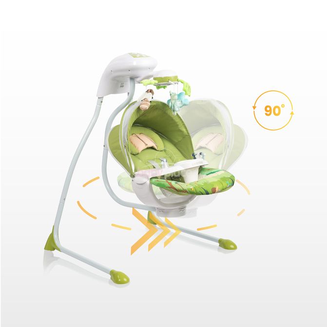 Ovládací panel umožňuje 5-polohové nastavenie rýchlosti a nastavenie časovača. Hojdačka ponúka 11 melódií a zvuky prírody, napríklad šum vody a spev vtákov, ktoré pomáhajú pri relaxácii a zaspávaní.